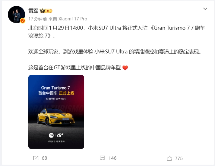 直播吧01月28日讯小米老板雷军今日宣布,北京时间1月29日14:00,小米SU7Ultra正式上线GranTurismo7/跑车浪漫旅7(即《GT赛车7》),是首台上线的中国品牌车型。