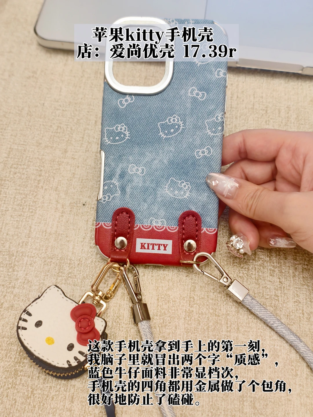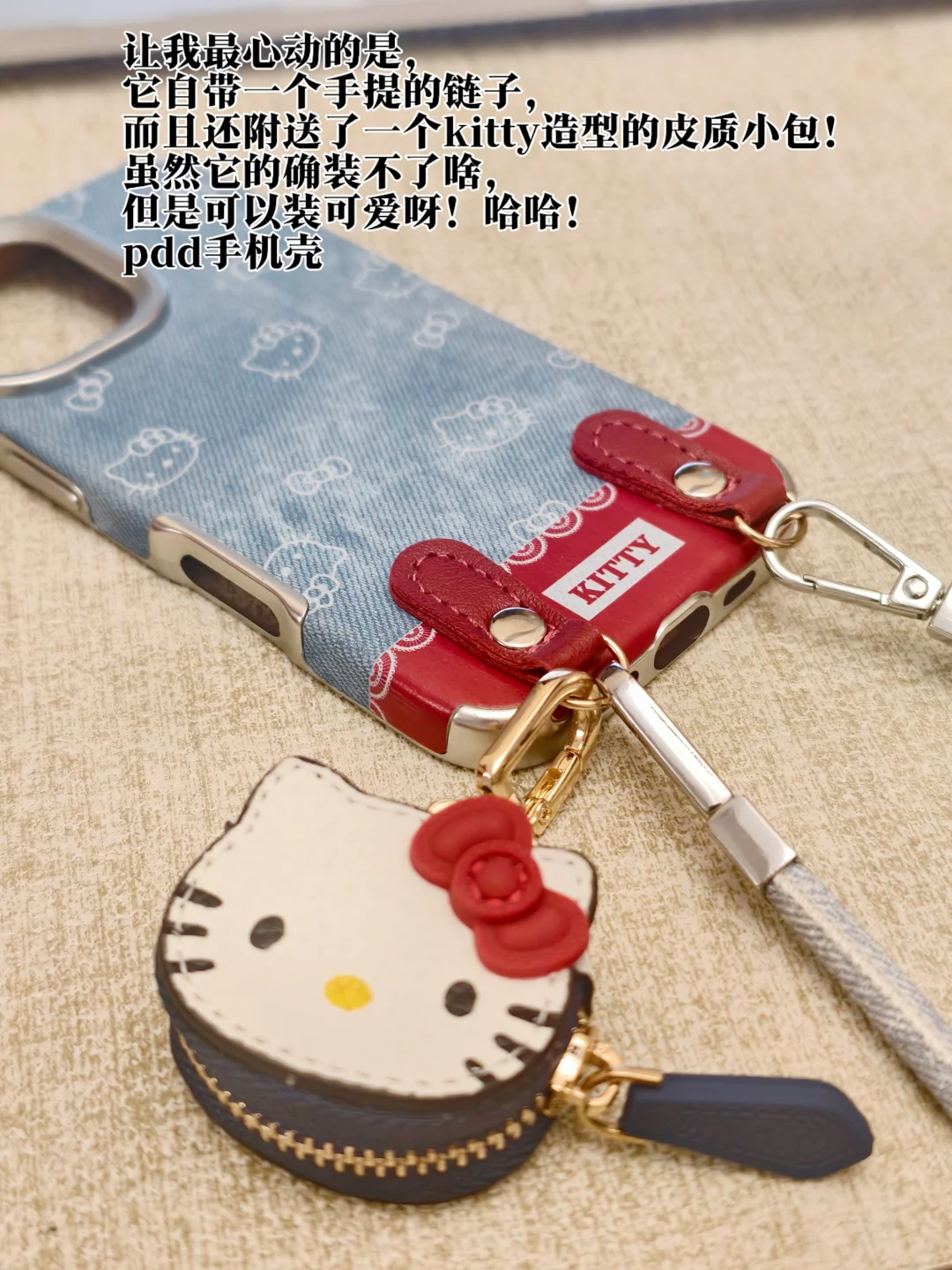 这款手机壳拿到手上的第一刻,我脑子里就冒出两个字“质感”,蓝色牛仔面料非常显档次,手机壳的四角都用金属做了个包角,很好地防止了磕碰。让我最心动的是,它自带一个手提的链子,而且还附送了一个kitty造型的皮质小包!虽然它的确装不了啥,但是可以装可爱呀!哈哈!