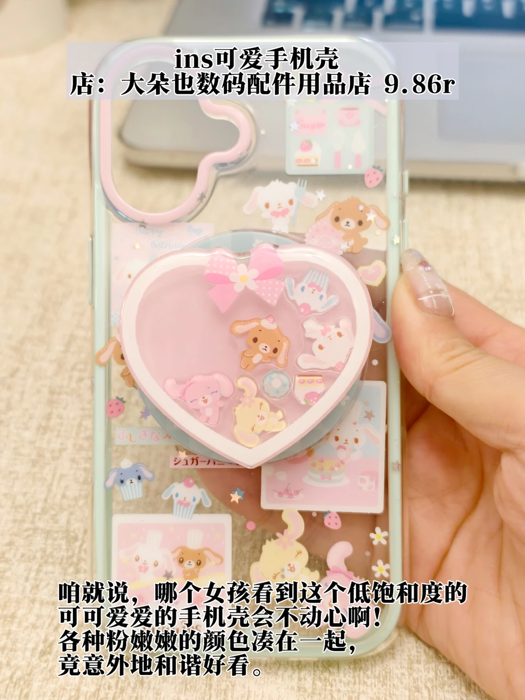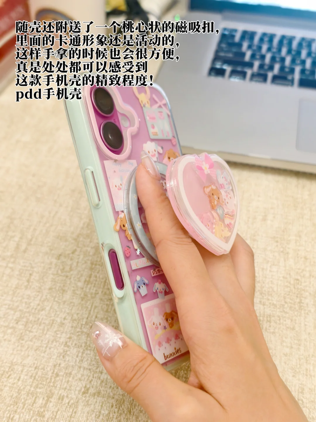 咱就说,哪个女孩看到这个低饱和度的可可爱爱的手机壳会不动心啊!各种粉嫩嫩的颜色凑在一起,竟意外地和谐好看,随壳还附送了一个桃心状的磁吸扣,里面的卡通形象还是活动的,这样手拿的时候也会很方便,真是处处都可以感受到这款手机壳的精致程度!