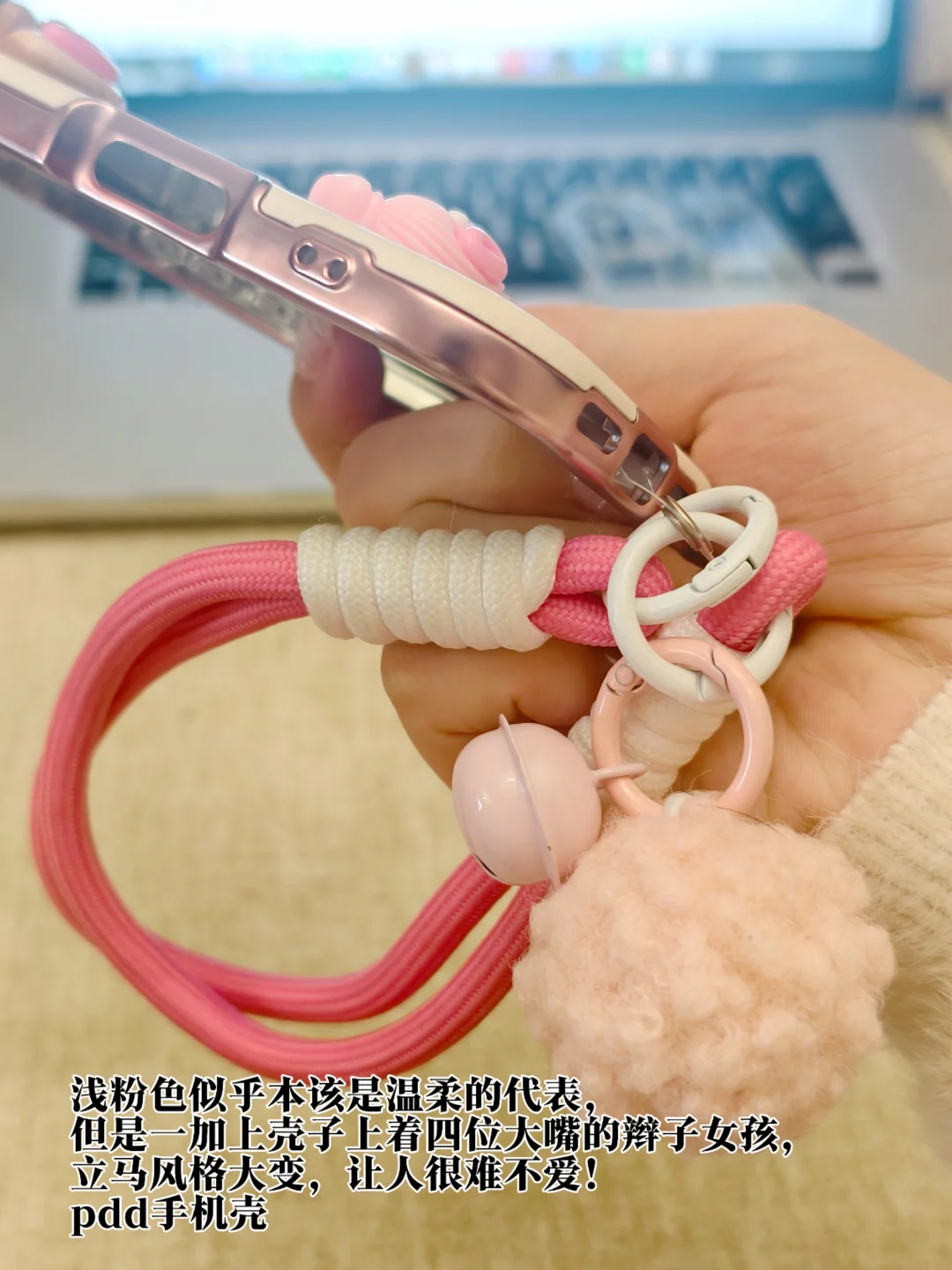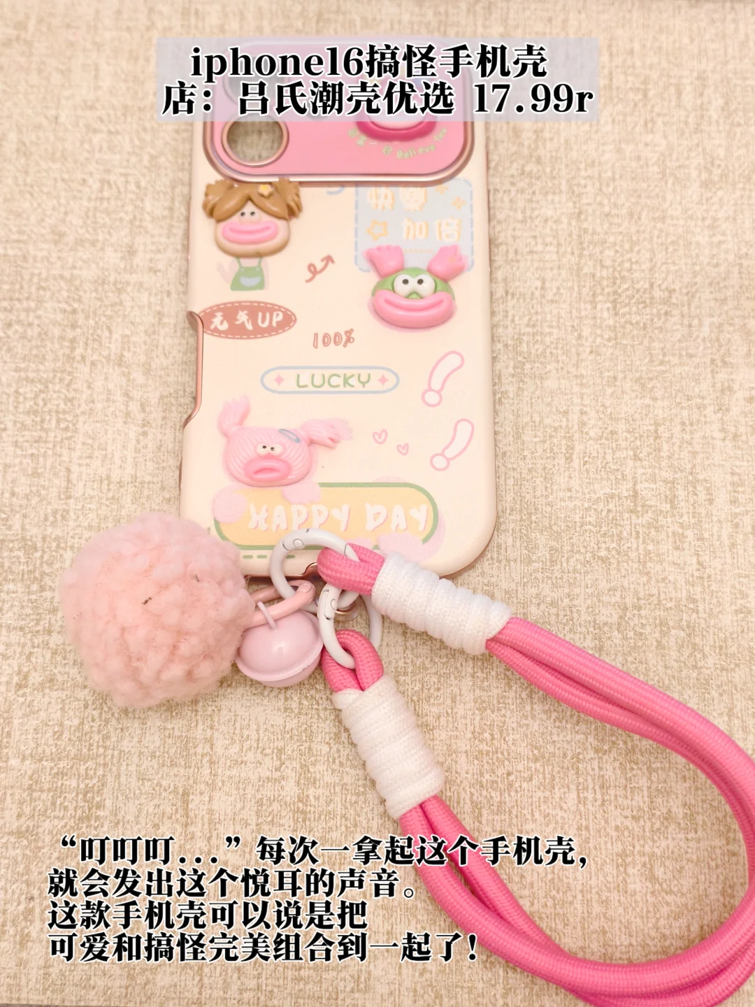 “叮叮叮...”每次一拿起这个手机壳,就会发出这个悦耳的声音。这款手机壳可以说是把可爱和搞怪完美组合到一起了,浅粉色似乎本该是温柔的代表,但是一加上壳子上着四位大嘴的辫子女孩,立马风格大变,让人很难不爱!