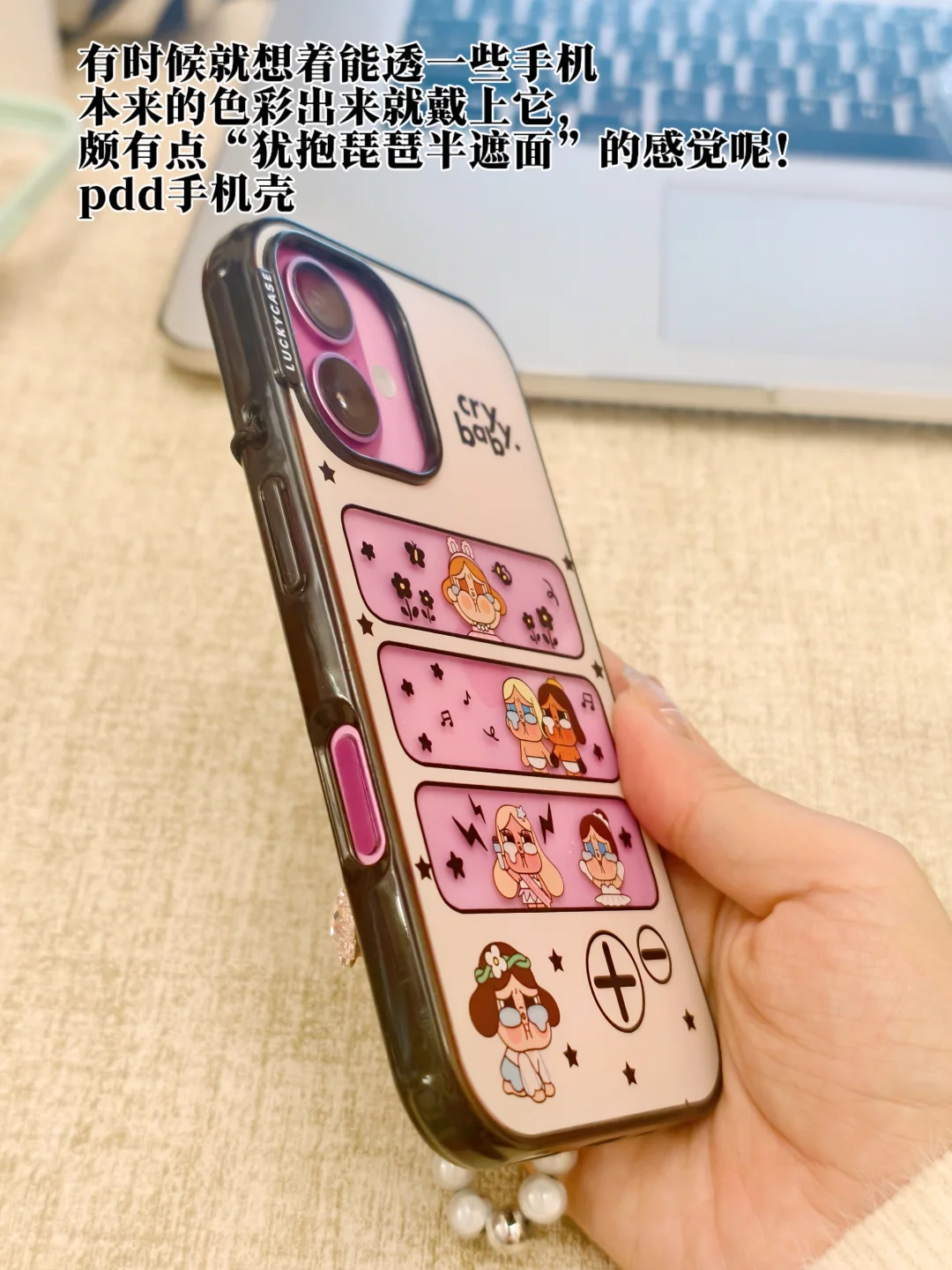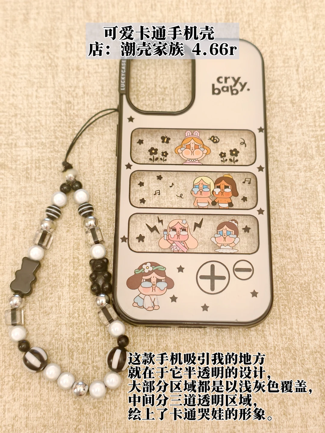 这款手机吸引我的地方就在于它半透明的设计,大部分区域都是以浅灰色覆盖,中间分三道透明区域,绘上了卡通哭娃的形象,有时候就想着能透一些手机本来的色彩出来就戴上它,颇有点“犹抱琵琶半遮面”的感觉呢!