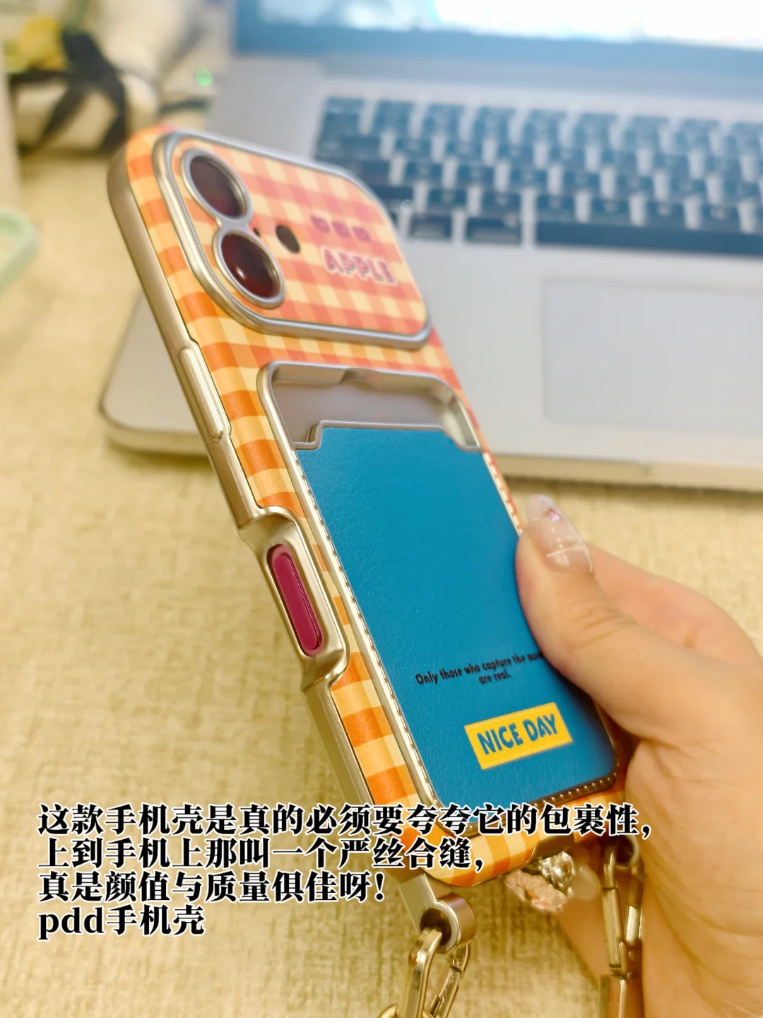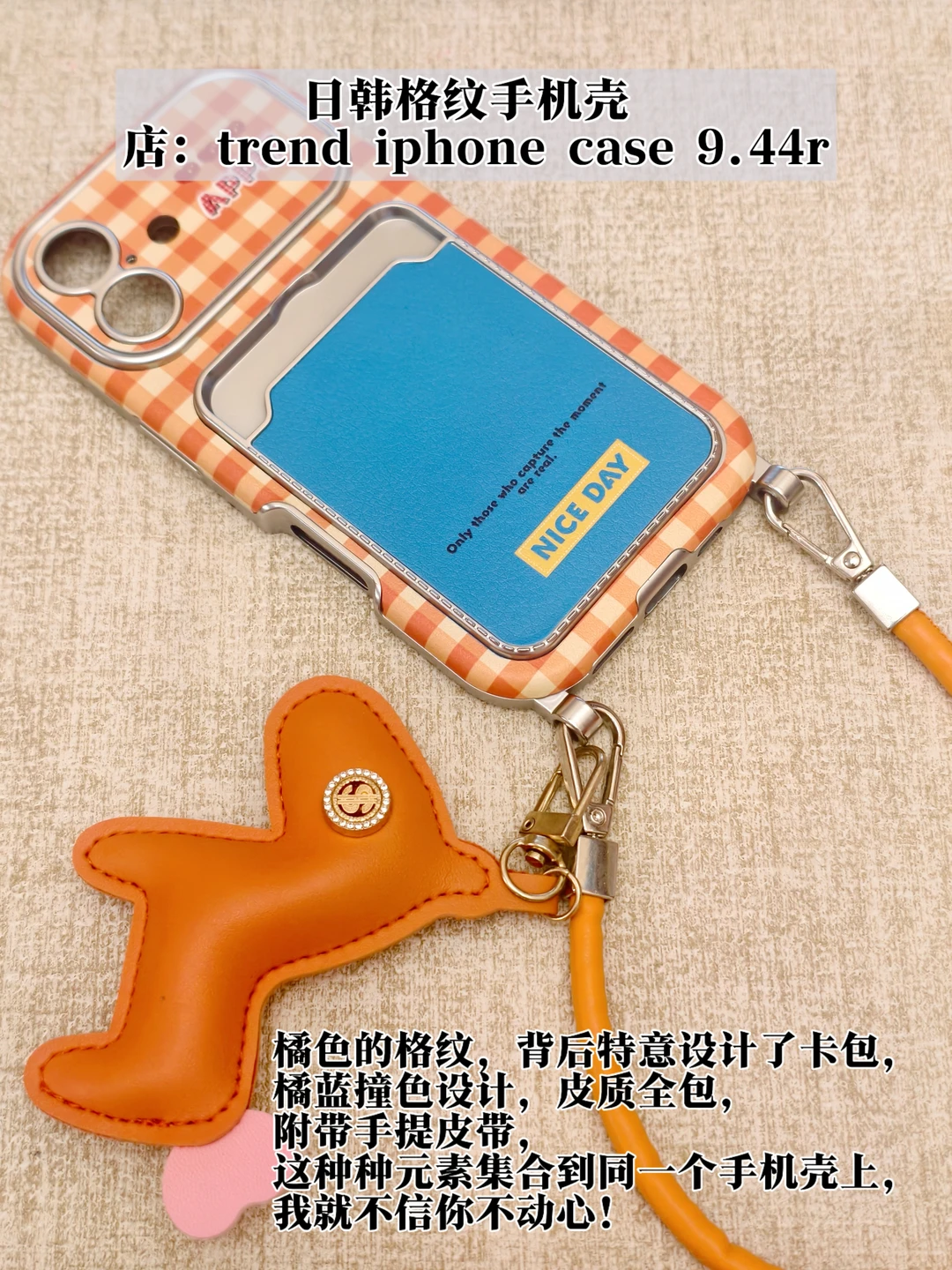 橘色的格纹,背后特意设计了卡包,橘蓝撞色设计,皮质全包,附带手提皮带,这种种元素集合到同一个手机壳上,我就不信你不动心!这款手机壳是真的必须要夸夸它的包裹性,上到手机上那叫一个严丝合缝,真是颜值与质量俱佳呀!