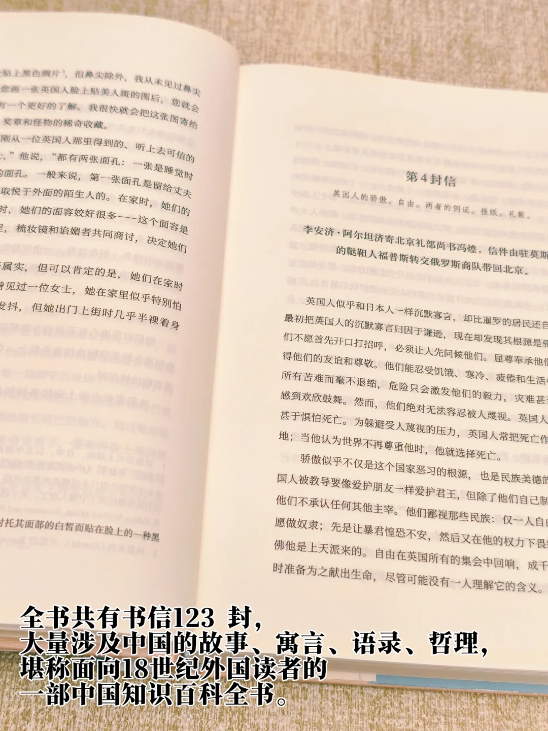 本书是一部18世纪的英语书信体小说,作者虚构了旅英华人李安济致友人的信件,借此讽喻英国社会,介绍中国文化。全书共有书信123 封,大量涉及中国的故事、寓言、语录、哲理,堪称面向 18 世纪外国读者的一部中国知识百科全书。