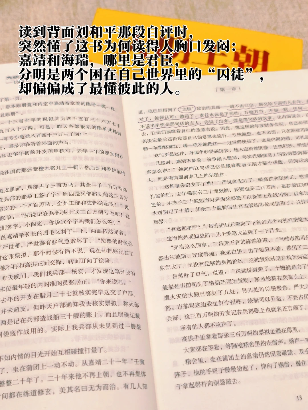 明黄色封面摊开时,三面刷边的金箔在光下泛着细闪——这版《大明王朝1566》,把嘉靖朝的压抑和贵气,先藏在了装帧里。读到背面刘和平那段自评时,突然懂了这书为何读得人胸口发闷:嘉靖和海瑞,哪里是君臣,分明是两个困在自己世界里的“囚徒”,却偏偏成了最懂彼此的人。