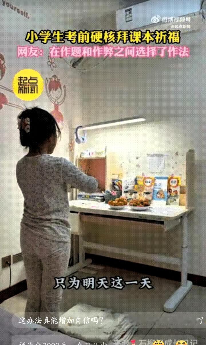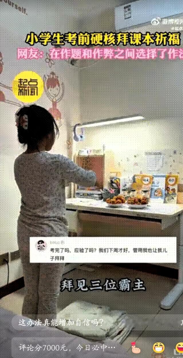 “太逗了!”陕西西安,一名小女孩在期末考试前一天“临时抱佛脚”,孩子把语数英三本课本立在桌上,摆上两盘橘子当贡品,手里拿着三支笔代替香,一本正经地对着书本叩拜,嘴里还念念有词,这一幕被妈妈悄悄拍了下来,没有刻意的表演,全是孩子最真实的小模样。 相信不少人看完都有同感,谁小时候考试前,没做过类似“临时抱佛脚”的事呢?有的把课本放在床头当枕头,想着睡着后知识能悄悄印进脑子里;有的对着笔默念,希望它能变成“神笔”,答题都能写对;还有的会特意穿件干净的衣服,就想讨个考试顺利的好彩头。这些看似幼稚的小行为,没有什么实际作用,却都是小时候面对考试,最单纯的小期待。 孩子的这个举动,其实不是迷信,只是用自己的方式缓解考试的小焦虑,给自己找一份心安。她认真摆弄贡品、虔诚叩拜的样子,能看出对期末考试的重视,也藏着面对考试的小紧张,这份童真的仪式感,特别真实。而妈妈没有打断,只是笑着记录,这份包容,也让这个小瞬间多了几分温暖。 其实这样的小举动,无关成绩好坏,只是童年里独有的小美好。长大后再回想,那些考前的小执念,不是傻事,而是我们小时候面对压力,最天真的自我鼓励。