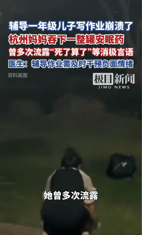 “悲剧还是发生了!”1月26日,浙江杭州,一女子辅导儿子作业时,因一道题反复讲了许多遍仍不会,情绪突然失控,竟直接吞下一整罐安眠药,随后昏迷不醒,家人发现后急忙送去医院,费了好一番功夫才脱离危险。网友:这得有多气人啊! 1月26日,浙江杭州,一位妈妈正在家里辅导儿子写作业,谁也没想到,一场因为作业引发的崩溃,差点酿成无法挽回的后果。 事情很简单,就是一道小学一年级的题目,妈妈翻来覆去讲了好多遍,可孩子还是懵懵懂懂,怎么也学不会。 一开始,妈妈还耐着性子一点点讲解,可随着一遍又一遍的重复,孩子依旧毫无头绪。 面对这样的情况,这位妈妈的情绪慢慢失控,最后彻底绷不住了,一时想不开竟直接吞下一整罐安眠药,随后就昏迷不醒。 当家人发现的时候都慌了神,来不及多想,赶紧抱着她往医院跑,医生连夜展开抢救,洗胃、补液,费了好一番功夫,才总算把她从鬼门关拉了回来,目前她的身体已经慢慢恢复,情绪也趋于稳定。 网友看到这件事,纷纷感慨“这得有多气人啊”,可只有了解背后的真相,才会发现,这位妈妈的极端行为,从来都不是一时冲动,而是长期压力的集中爆发。 说白了,这根本不是一道题的问题,据了解,这位妈妈多年前就因为产后抑郁,被确诊为抑郁症伴焦虑,这些年一直在服药治疗。 孩子上幼儿园的时候,她的情绪还相对平稳一些,可随着孩子步入小学,她就把全部的心力都放在了孩子的教育上,对孩子抱有很高的期待。 她满心以为,自己拼尽全力辅导,孩子就能达到预期,可现实却给了她一次次打击。 孩子不听话、学习跟不上,一次次达不到她的要求,让她倍感焦虑和挫败,这种期待与现实的落差,让她的心理压力越来越大,甚至曾多次流露过“死了算了”这样的消极言语。 加上最近临近期末,不管是家长还是孩子,都面临着不小的学习压力,辅导作业的难度也随之增加,这最后一道题,就成了压垮她的最后一根稻草。 其实很多家长都有过辅导作业崩溃的时刻,对着孩子讲不明白的题目,忍不住发火、生气,可很少有人能意识到,有些情绪的积累,会慢慢压垮一个人。 尤其是对于本身就有心理问题的这位妈妈来说,她的情绪调节能力比普通人弱很多,一点小事,就可能成为情绪爆发的导火索。 辅导作业的初衷,是帮助孩子更好地学习,而不是让家长和孩子互相折磨。 家长对孩子有期待是正常的,但也要根据孩子的实际情况,适当降低期待,毕竟每个孩子的接受能力不同,成长节奏也不一样。 更重要的是,家长也要学会关注自己的情绪,不要把所有的压力都自己扛着。 如果觉得情绪快要失控,不妨先停下来,缓一缓,找家人倾诉一下,必要的时候寻求专业的帮助,千万不要因为一时冲动,做出让自己和家人后悔的事。 这场风波虽然暂时过去了,但也给所有家长提了个醒,辅导作业固然重要,可自身的心理健康和家庭的和睦,更值得我们珍惜,不要让过高的期待,变成伤害自己和孩子的利刃。 对此您有什么不同的看法,可以在评论区留言讨论!!! 信息来源:《辅导一年级儿子写作业崩溃了,杭州妈妈吞下一整罐安眠药,曾多次流露“死了算了”等消极言语,医生:辅导作业需及时干预负面情绪》极目新闻