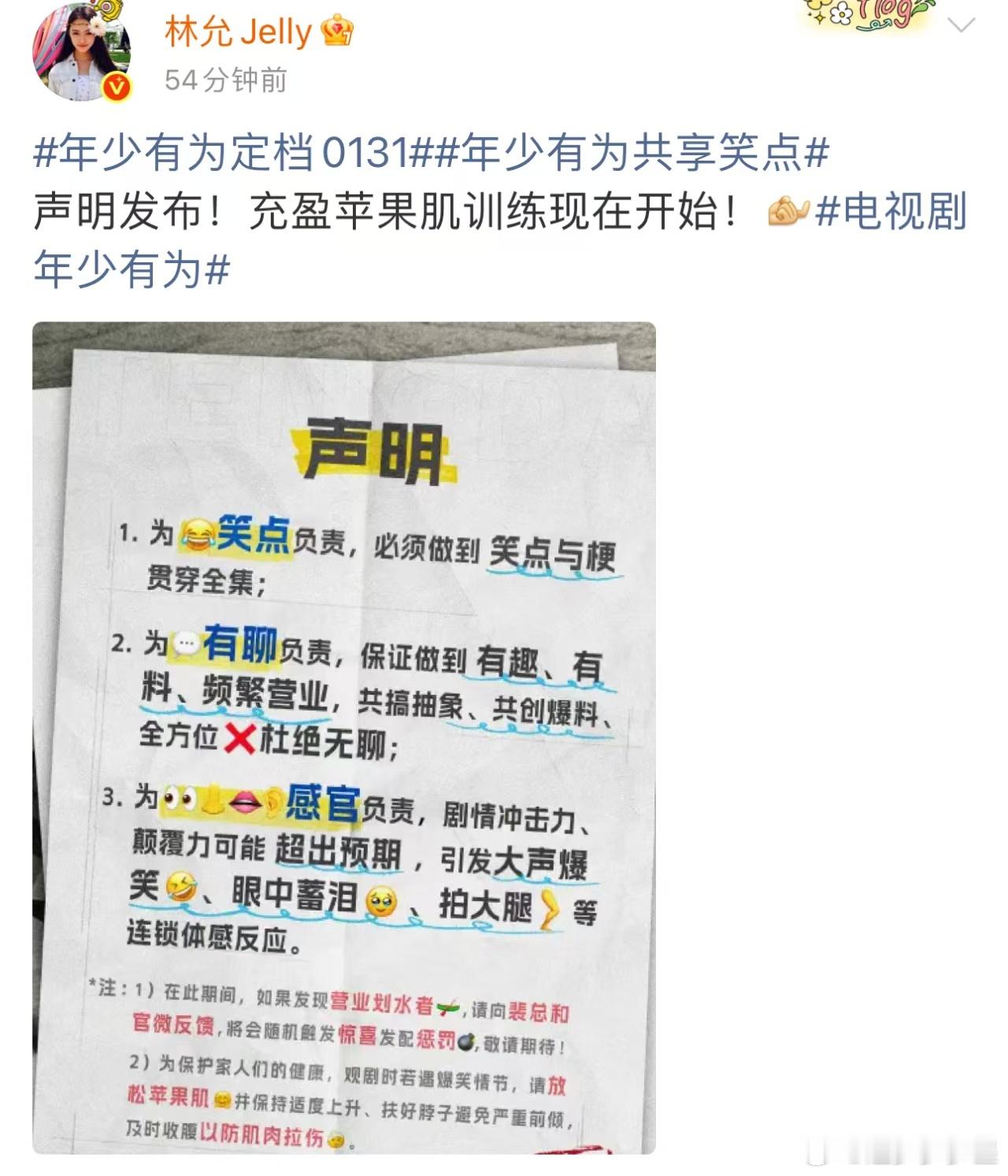 年少有为共享笑点电视剧年少有为这波共享笑点声明的剧宣太有意思了,彭昱畅林允都参与