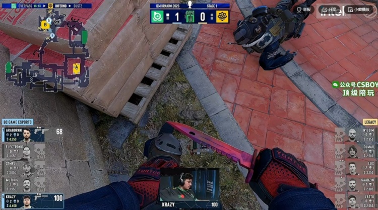 手枪局Legacy一波爆弹进攻B区,BC四人从香蕉道回防,残局s1mple白给但是aragronN和krazy各自双杀!BC拆包成功赢下手枪局!1-0!