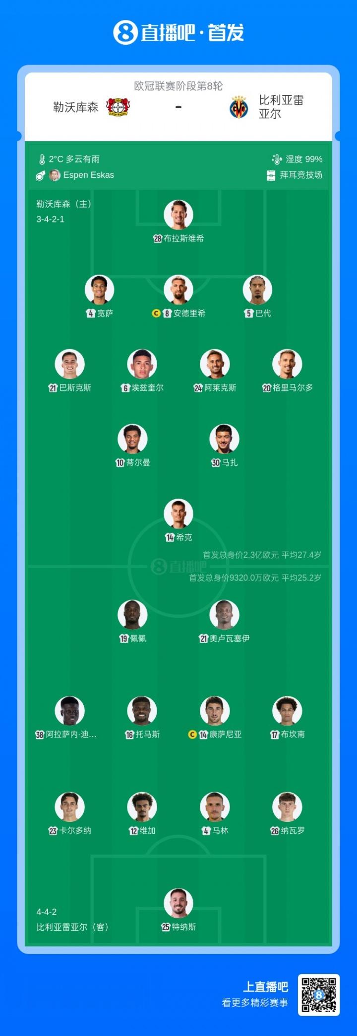 直播吧1月29日讯北京时间凌晨4点,欧冠联赛阶段第8轮,勒沃库森主场迎战比利亚雷亚尔,赛前双方公布首发阵容。