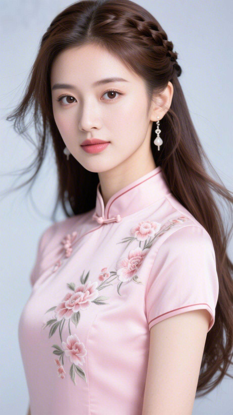 粉襟畔的柔花风 浅粉旗袍裹着温软的光,襟边绣纹里的花簇像沾了晨露的春枝,风掠过发梢的弧度都轻缓下来。 编发挽着几缕垂发,耳坠珠串随呼吸轻晃,眉目间浸着江南春般的舒展。她抬眼时,眼底是淡得恰好的静,像窗纱外漫进来的日色,不灼人,却妥帖得让人心安。 我们总执着于浓艳的色彩,却常忽略这种浅淡的好:像春茶初绽的清芬,像软风裹着的花影,不用刻意声张,自有一种静下来的松弛。 这正是东方韵里的柔——不喧不闹,只是立在那里,便成了一段轻缓的诗意。 旗袍里的柔意 东方美学轻韵