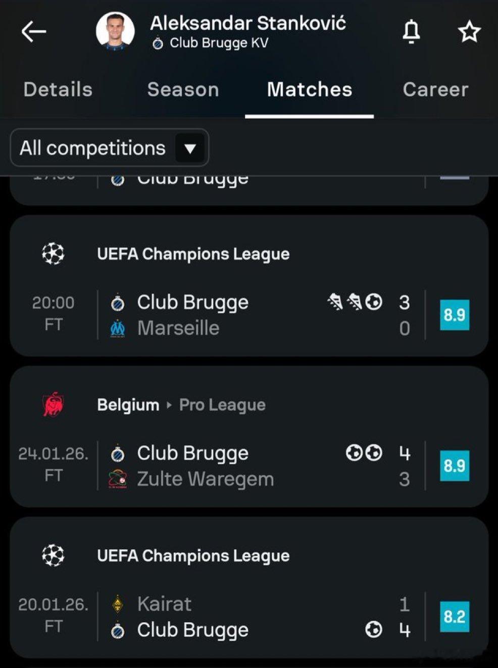 在最近的3场比赛中 斯坦科维奇贡献了4球2助攻欧冠直通淘汰赛8队出炉热点现场 许多欧洲的大俱乐部都在密切关注着斯坦科维奇