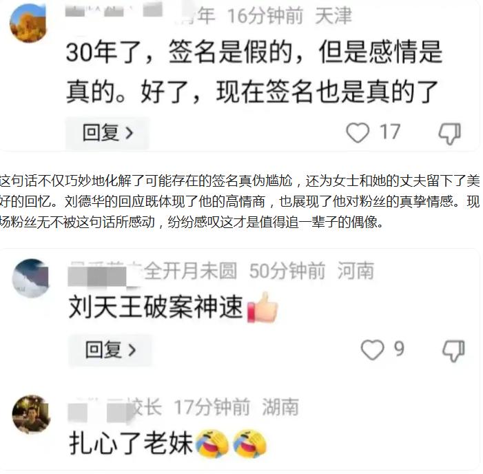 【粉丝拿30年前签名,找刘德华鉴定真伪,华哥高情商回复】 2024年,刘德华携《红毯先生》在深圳路演。互动环节,一位女士手持三十年旧签名,追问签名真伪。刘德华未直接回应,笑着在照片重签,温情调侃:“不是也好,感情是真的。” 巧妙化解尴尬,尽显高情商与对粉丝的真诚。现场粉丝深受感动,网友也纷纷点赞,称他是值得追一辈子的偶像。