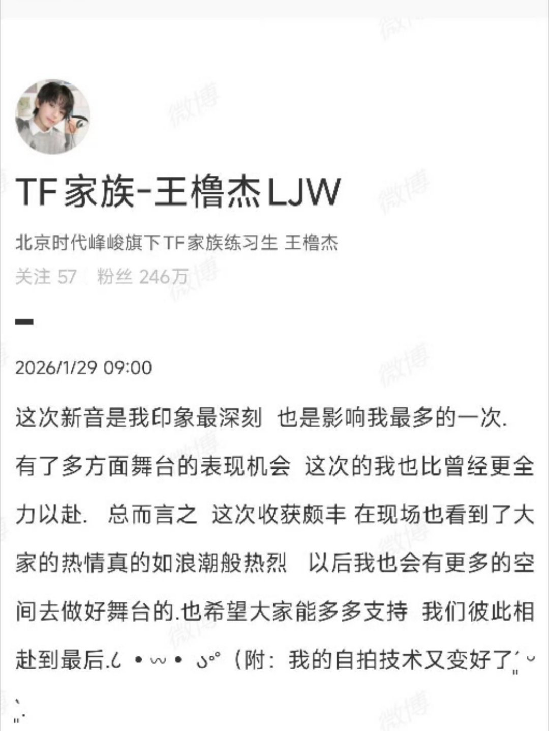 王橹杰新音总结 说这次新音是印象最深刻 也是影响自己最多的一次 还说有了多方面