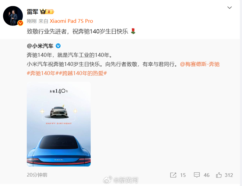 【#雷军为奔驰庆生#】#雷军祝奔驰140岁生日快乐# 29日,为奔驰庆生 :致敬行业先进者,祝奔驰140岁生日快乐