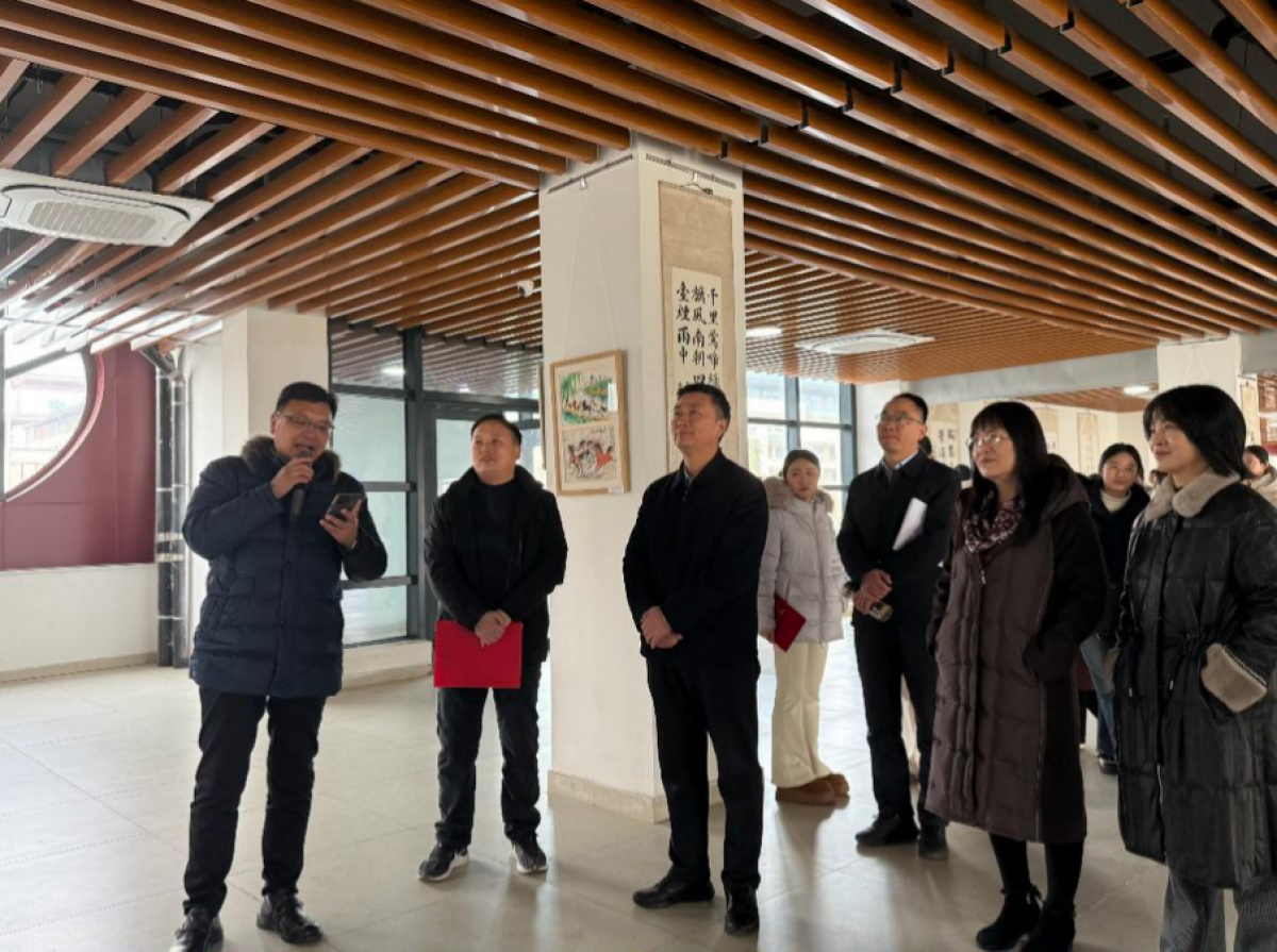 仪式结束后,与会人员移步展厅参观展览。综合楼展厅内满溢着翰墨的清香,学校团委和艺术教研室组织专家对师生作品进行评审,从三百余幅投稿中精选出优秀作品进行展出。这些作品涵盖了书法、国画、油画、版画和剪纸等多种艺术形式,题材广泛、风格多样,艺术气息浓厚。布展小组的工作人员全程提供引导讲解,师生们驻足观赏、相互交流,不时为精彩作品发出由衷赞叹。