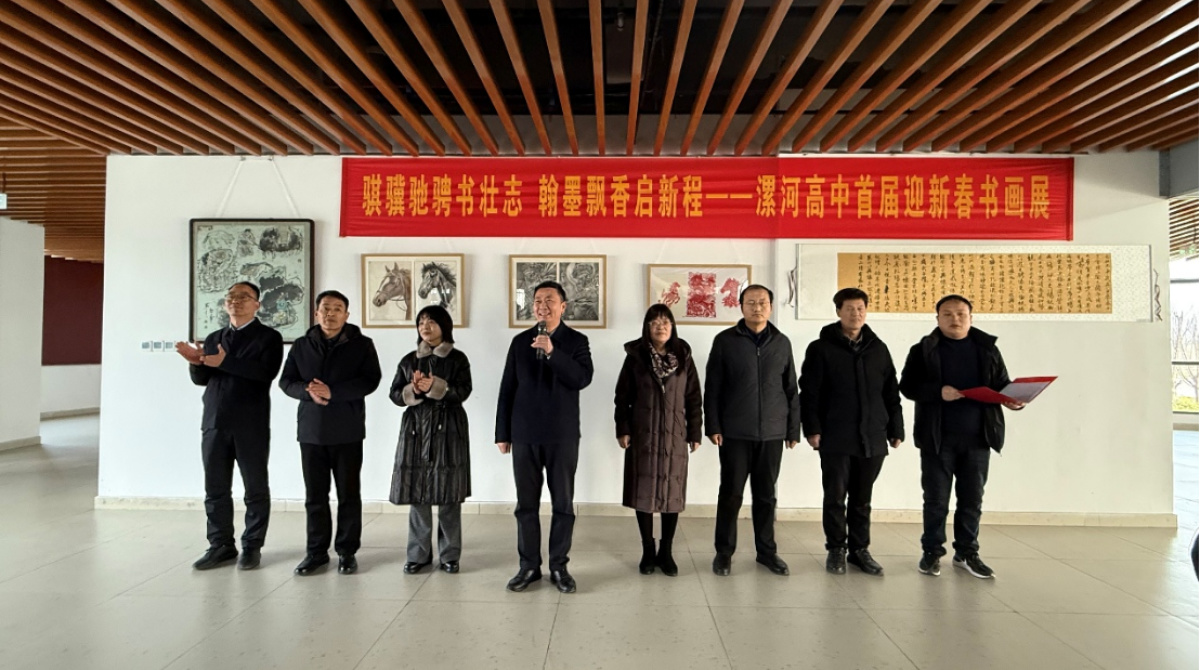 为丰富校园文化生活,厚植师生文化自信,传承中华优秀传统文化,1月28日,漯河高中首届迎新春书画展开幕。漯河高中党委书记赵耀堂,党委副书记、校长郭爱红,党委副书记陈爱红,党委委员、纪委书记刘彬,党委委员、副校长周振江、柳荣军和丁爱军出席开展仪式,此次开展仪式由教务一处主任、团委书记、高一一部年级主任康磊主持。