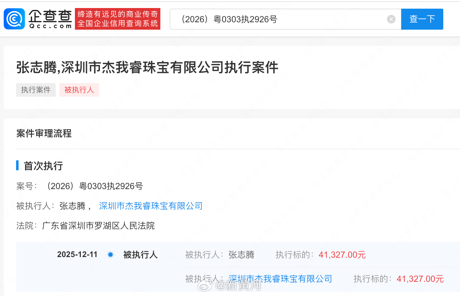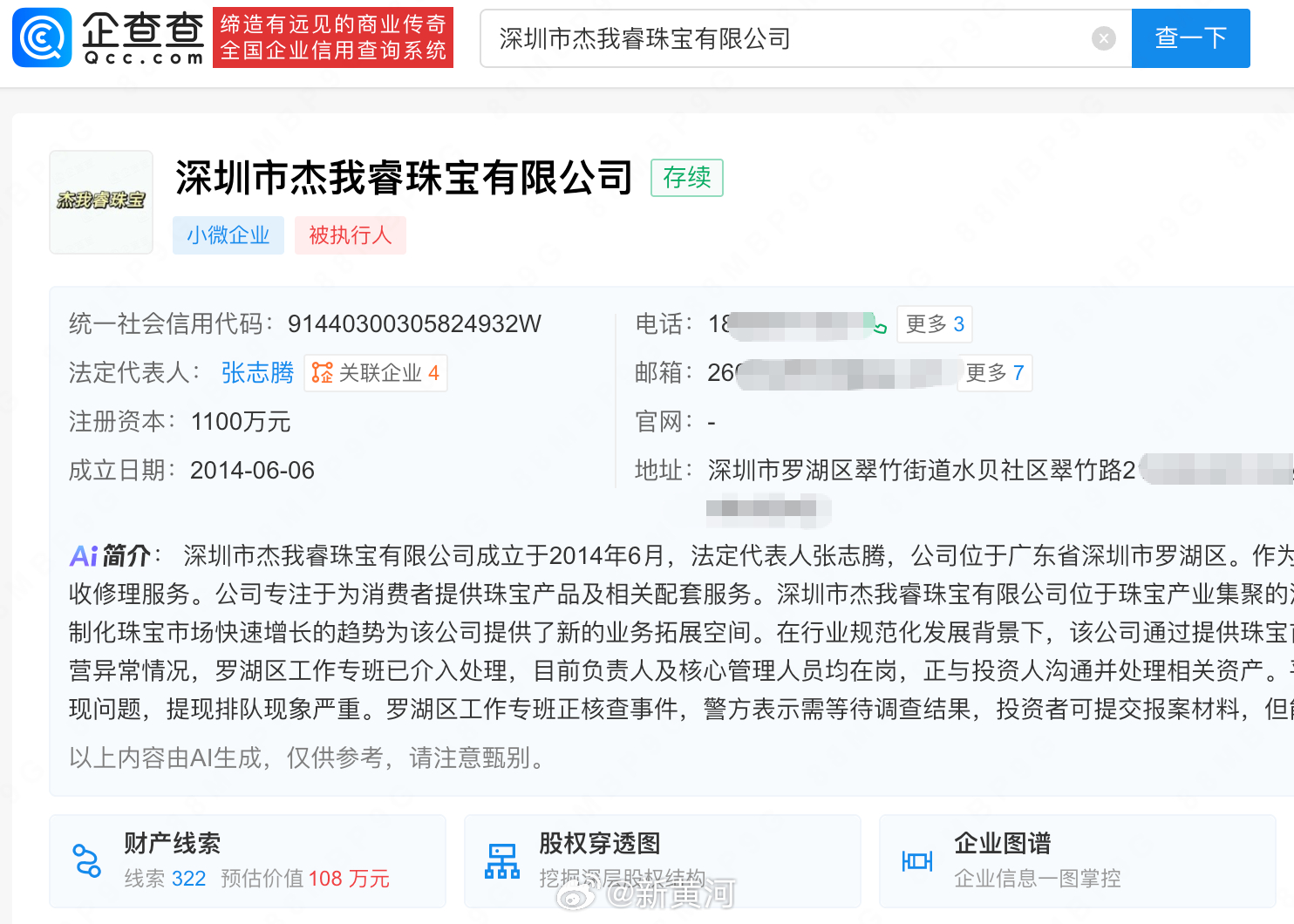 【#杰我睿老板商业版图#】#杰我睿老板名下4家公司3家注销#近日,有关深圳市水贝一黄金预定价平台出现异常的消息流传。大量用户反映自己被平台“拉黑”,无法继续交易。1月28日,罗湖区工作专班发布情况通报称,第一时间组建工作专班介入,督促企业履行主体责任,目前,深圳杰我睿珠宝公司负责人及相关核心管理人员均在岗,积极开展与投资人沟通、资产梳理和兑付等工作。据企查查信息显示,涉事公司深圳市杰我睿珠宝有限公司成立于2014年6月,法定代表人、董事、经理均为张志腾,注册资本1100万人民币,由张志腾、陈长林共同持股,当前张志腾名下关联4家公司,仅1家为存续状态,值得注意的是,去年12月,张志腾、深圳市杰我睿珠宝有限公司被强制执行4万余元。