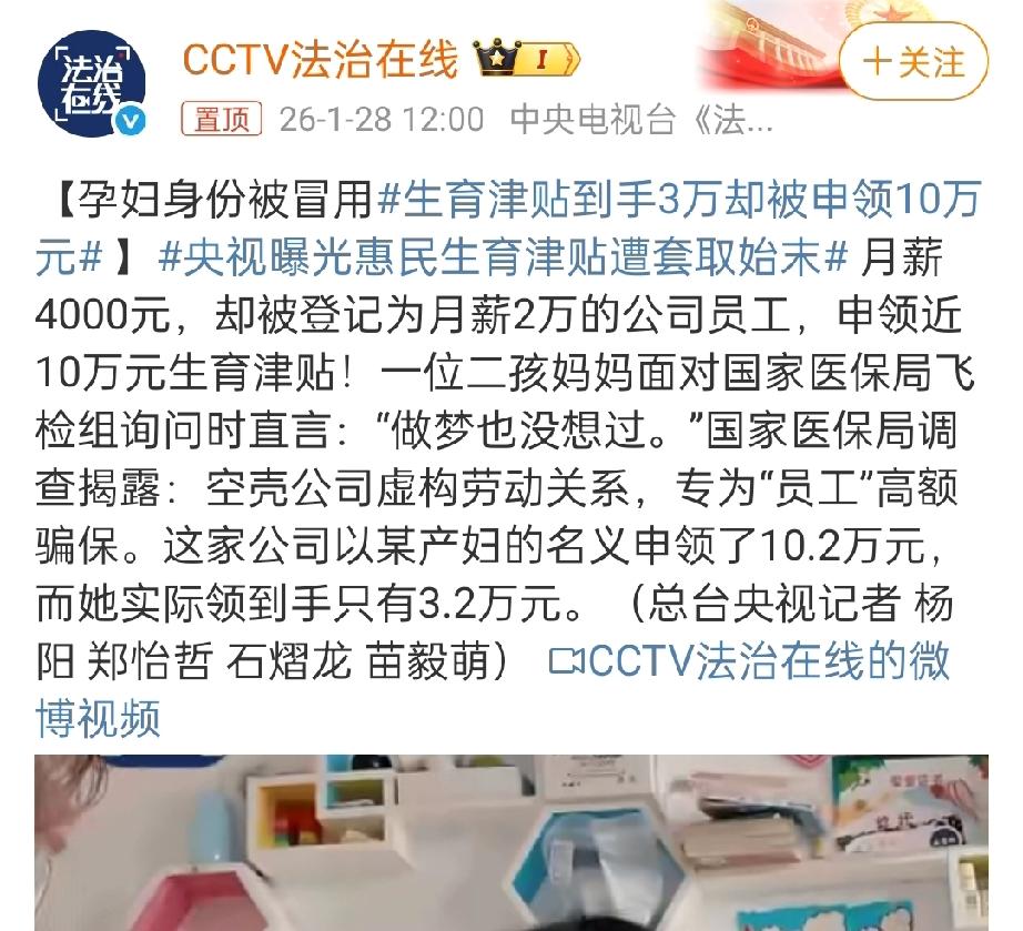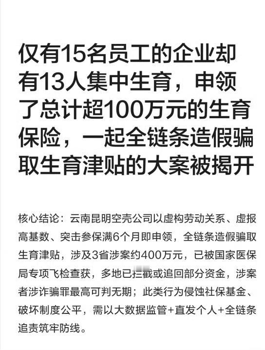 产妇月薪4000元,却被登记为月薪2万,申领10.2万元生育津贴!产妇实际到手3.2万元…如果直接发放到产妇实名银行账号,能不能规避这一漏洞? 看了下,这次是大数据立功了,国家医保局看到一条线索非常醒目,仅15名员工的企业,短时间内13名员工集中生育。涉案公司名为云南通宏贸易有限公司,表面上仅有15名"员工",其中13名育龄女性在2024年至2025年上半年密集生育,人均申领生育津贴约10万元,总额超100万元。 经查,该公司为典型的"四无"空壳公司:无实际经营地址(注册地为居民住宅,房东毫不知情)、无营收、无利润、无纳税,资产仅100元。犯罪团伙在云南、四川、浙江三地复制该模式,总涉案金额达400余万元。国家生娃补贴 生育津贴计算 分娩补贴