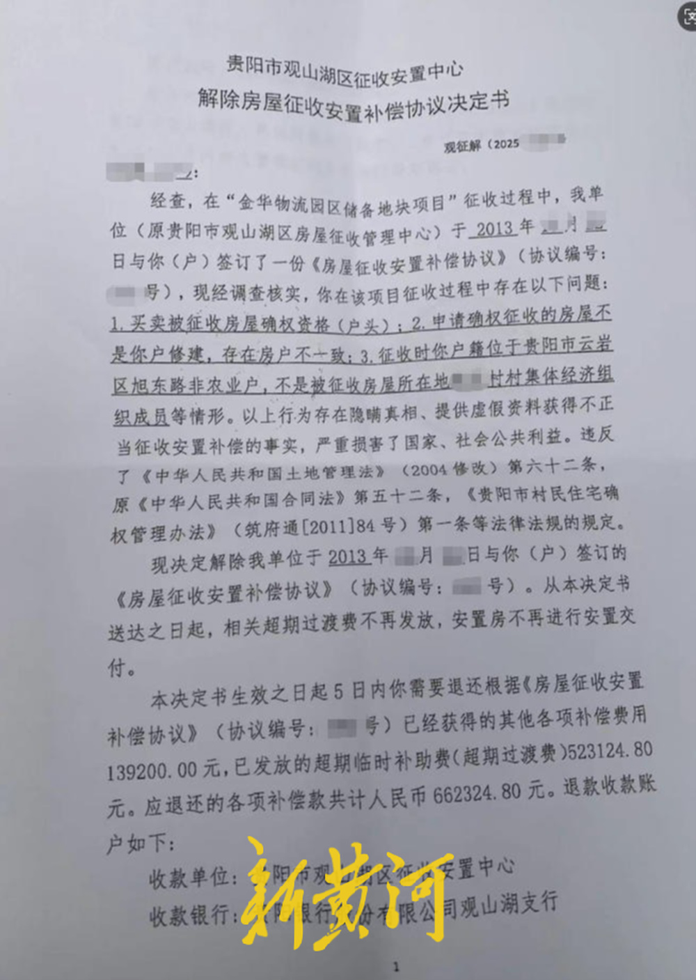 新黄河记者调查发现,从2025年7月开始,不少征拆户都收到了观山湖区征收安置中心下达的《解除房屋征收安置补偿协议决定书》或者《事先告知书》,粗略估计涉及人数已达数百人,理由包括买卖被征收房屋确权资格(户头)、申请确权征收的房屋存在房户不一致、征收时户籍非农业户、房屋未提交合法的建房或联建资料等情形。决定书称,以上行为存在隐瞒真相、提供虚假资料获得不正当征收安置补偿的事实,违反了相关法律法规的规定,现决定解除原来签订的《安置协议》,相关超期过渡费不再发放,安置房不再进行安置交付,并要求退还根据《安置协议》已经获得的过渡费、超期过渡费等各项费用数十万元不等。