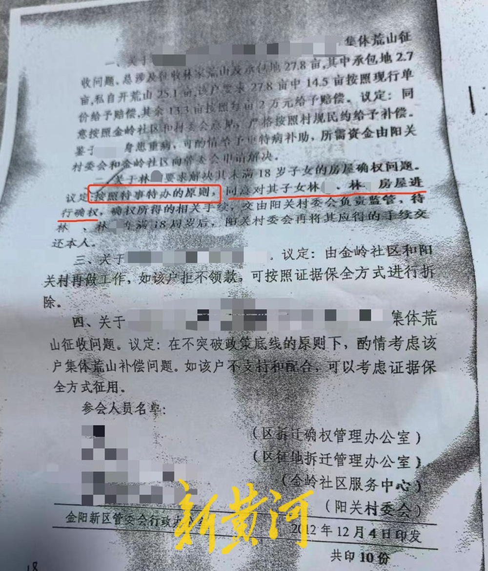 作为贵阳市的新城区,观山湖区开发建设的历史仅有二十多年。2012年,观山湖区正式挂牌成立后,开始大规模征迁工作。位于观山湖区阳关村的林先生家也在拆迁范围之内。林先生告诉新黄河记者,他在当地一共有两栋房子,一栋三层,另一栋两层,两栋房加起来一共1000多平方米。不过,按照当时政策,夫妻俩只能算作一户,最多分到240平方米的置换面积,多出来的部分只能按很低的价格进行补偿。“这样我肯定不同意拆嘛,为了加快签约进程,村委会、拆迁部门跟我协商后,提出一个解决方案,给我家中两个孩子也确权,这样就变成三户,我同意了。”根据林先生提供的当时出具的一份《关于贵州益佰医药工业区涉及林家、向家等户征地拆迁专题会议纪要》中提到,关于林先生要求解决其未满18岁子女的房屋确权问题,议定按照“特事特办”的原则,同意对林先生两名子女房屋进行确权,确权所得的相关手续交由村委会负责监管,待子女满18岁后,村委会再将其应得的手续交还本人。这份《会议纪要》上记录着当时的参会人员有:区拆迁确权管理办公室、区征地拆迁管理办公室、村委会等。