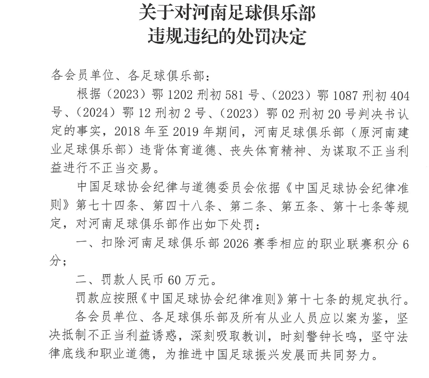 一、扣除河南足球俱乐部2026赛季相应的职业联赛积分6分