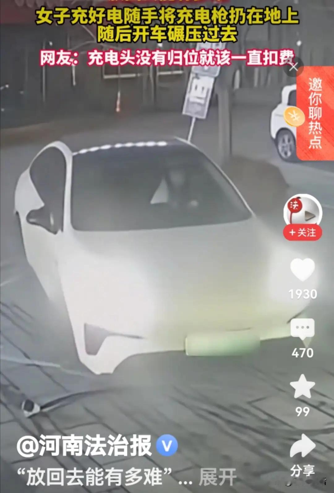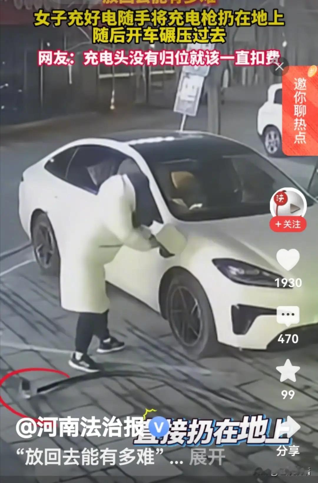 龌龊的行为! 1月26日,山东青岛某充电站,一打扮时尚的年轻女子在给自己的电车充完电后,竟将充电枪扔地上,然而“潇洒”上车,开着车从充电枪上碾压而过。视频曝光后,网上一片哗然,众网友纷纷谴责女子的这一行为。 有网友说,应该曝光她的正脸、扒出她的单位、不能让她这种恶劣行为任意泛滥!这明显的是在实施破坏公共设施行为吗、法律上有没有破坏公共设施罪这一条?几年?罚多少钱?好好叫她到专门的地方多呆几天好好学习一下法律法规! 也有网友说,充电装置可以升级管理功能,充电枪不归位,就视为还在充电! 还有网友说,看似人模人样,精致的外表,却做这种着故意损坏公共财物的事,应该受到舆论的谴责和法律的制裁。 然而,事情远远没有结束。就在网络上热议不断的同时,这个事件似乎也折射出更深层次的社会问题——我们对公共责任感的缺失、对规则的漠视,以及人性中那一抹难以抹去的“自我中心”。 你是否曾在日常生活中,看到过类似的“龌龊”行为?或许是一句不经意的吐槽,一次随手乱扔垃圾,甚至是一场“无伤大雅”的争执。我们总喜欢用“别人的事情我不管”来麻痹自己,殊不知,这些微不足道的行为,正在一点点侵蚀着我们这个社会的底线。 这位女子的行为,无疑令人愤怒,但更值得我们深思的是:她的背后,反映出一种“我行我素”的心态。这种心态在当今社会似乎变得越来越普遍——只要不直接影响到自己,规则可以暂时搁置,公共利益可以被忽视。难道我们真的对“公共”二字变得麻木了吗?还是说,法律的威慑力还远远不够? 其实,很多时候,问题的根源不在于个别人的“龌龊”,而在于我们每个人心中的那份责任感。一个社会的文明程度,绝不是靠少数人的“自觉”堆砌起来的,而是每个人都能在日常中坚守底线、勇于担当的积累。 有人说,法律是底线,但更重要的是,我们每个人心中的那份“道德底线”。如果我们都能从自己做起,从身边的小事做起,拒绝“碾压公共设施”的冲动,拒绝“只顾自己”的短视,或许,这个社会会变得更加温暖和有序。 所以,面对这起事件,不妨问问自己:在这个社会中,我能为公共利益做些什么?我们是否还能保持那份对规则的敬畏和对他人的尊重?每一个微小的善意和责任心,或许都能成为改变的起点。 让我们不要只停留在谴责和指责上,而是用行动去传递正能量。毕竟,文明的社会,是由我们每个人共同呵护的。充电枪乱丢