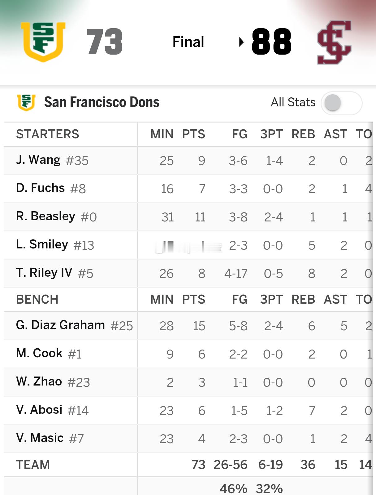 刚刚结束的一场NCAA比赛,旧金山大学以73:88负于对手,王俊杰出场25分钟,6投3中仅得到9分2篮板,赵维伦出场2分钟,1投1中得到3分。至此,今天出战NCAA比赛的四位中国男球员得分都没有上双。海外中国球员 王俊杰Barry NCAA超话[超话]