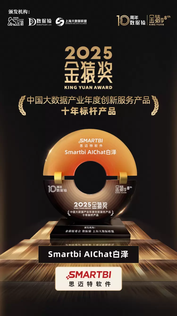 在AI智能体与商业智能深度融合的浪潮中,国内商业智能领军厂商思迈特软件(Smartbi)近期喜讯不断。旗下核心产品SmartbiAIChat白泽凭借在技术创新、场景落地与行业价值创造上的亮眼表现,接连斩获德本咨询(DBC)、数据猿、沙丘智库等权威机构的重磅认证,用实力诠释了AI与BI融合的创新价值。
