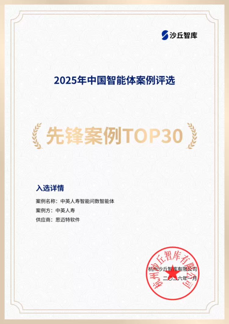 真正的技术实力,终究要在商业场景中检验。在沙丘智库主办的2025年中国智能体先锋案例评选中,思迈特软件与中英人寿联合打造的"中英人寿智能问数智能体"项目,从100+企业级实践案例中脱颖而出,凭借在金融场景的深度适配与显著业务价值,成功入选先锋案例TOP30,成为金融行业AI智能体落地的标杆范例。