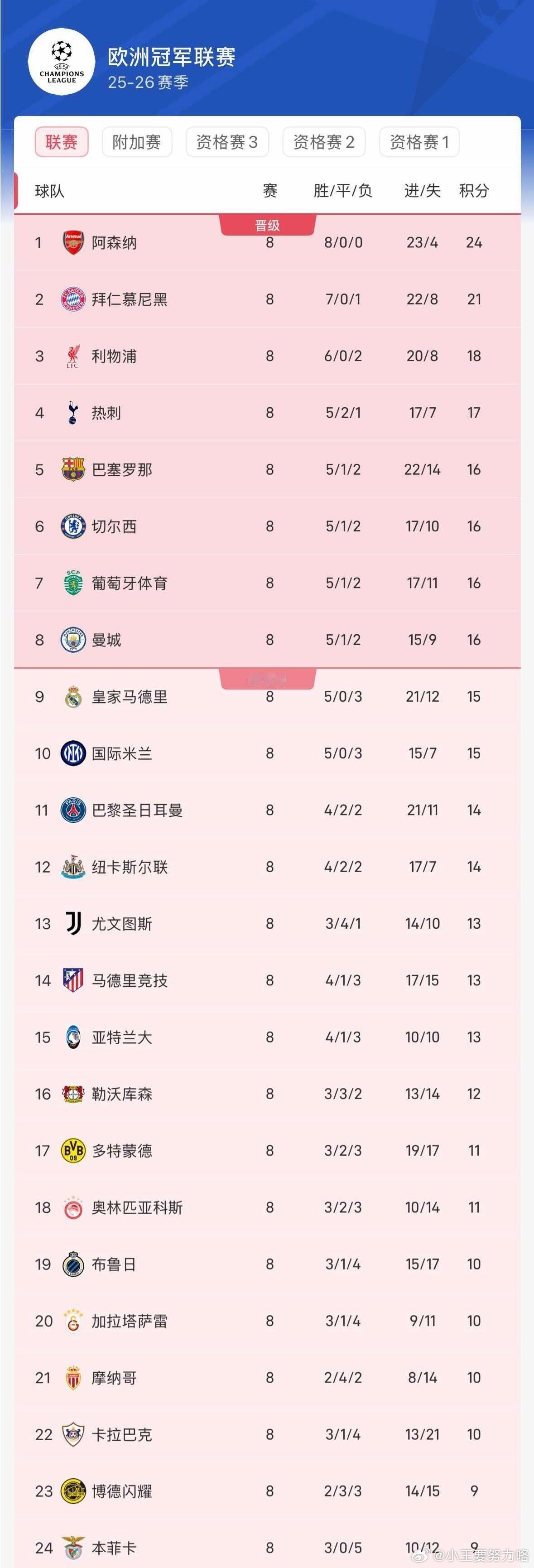 欧冠联赛阶段大结局:皇马、大巴黎跌入附加赛,本菲卡压哨晋级1月29日凌晨结束的欧冠联赛阶段末轮,18铲比赛全部战罢,36支球队的积分形势全部出炉,卫冕冠军巴黎圣日耳曼1-1战平纽卡跌出前八,将连续两年参加淘汰赛附加赛,巴萨、切尔西、曼城均取胜以前八身份直通16强。皇马爆冷不敌本菲卡,以一名之差无缘直通,被迫跌入附加赛区;意甲卫冕冠军那不勒斯惨遭淘汰。欧冠联赛足球欧冠 8支直通16强球队:阿森纳、拜仁、利物浦、热刺、巴萨、切尔西、葡萄牙体育、曼城16支附加赛球队:皇马、国米、巴黎、纽卡、尤文、马竞、亚特兰大、勒沃库森、多特蒙德、奥林匹亚科斯、布鲁日、加拉塔萨雷、摩纳哥、卡拉巴克、博德闪耀、本菲卡12支遭淘汰球队:马赛、帕福斯、圣吉罗斯、埃因霍温、毕尔巴鄂竞技、那不勒斯、哥本哈根、阿贾克斯、法兰克福、布拉格斯拉维亚、比利亚雷亚尔、凯拉特