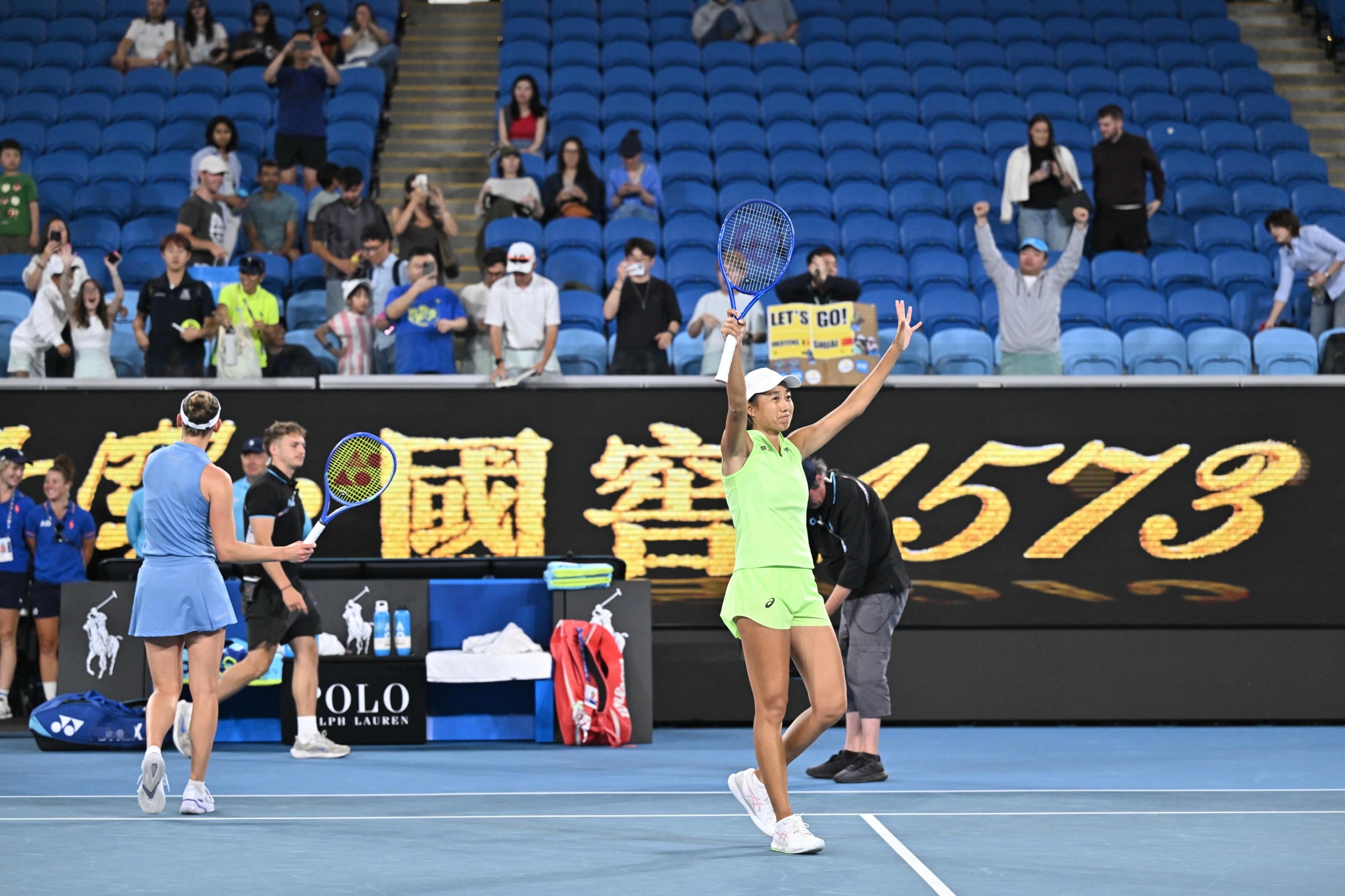 张帅进澳网女双决赛澳网2026 女双半决赛,张帅/梅尔滕斯组合6-3/6-2战胜柴原瑛菜/兹沃娜列娃,闯入决赛,将和达尼丽娜/克鲁尼奇争冠。这很澳网