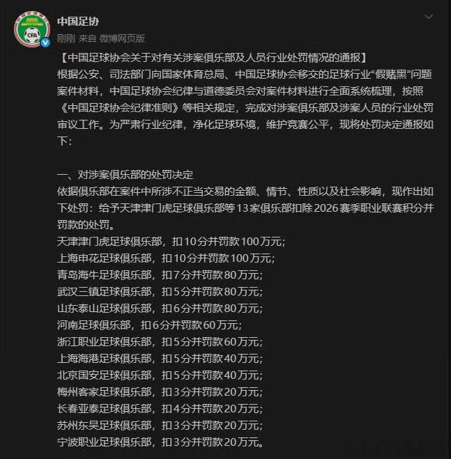 中国足球国家队9支中超球队被足协罚分【9支中超球队被罚分,重庆铜梁龙保级形势大好】1月29日上午10点,中国足协召开了“假赌黑”问题专项整治新闻发布会,会上国家体育总局、公安部和中国足协首先公布了对13家足球俱乐部的处罚结果(9家中超、4家中甲),其中9家中超俱乐部因涉及“假赌黑”问题被罚分:上海申花、天津津门虎被罚10分,青岛海牛被罚7分,河南建业和山东泰山被罚6分,浙江FC、北京国安、上海海港、武汉三镇被罚5分。9支俱乐部的球队将在今年中超将以负分起步,也意味着中超“升班马”辽宁铁人、重庆铜梁龙以及其他未被罚分的云南玉昆、青岛西海岸、大连英博、深圳新鹏城都保级形势大好,成都蓉城则有望继续角逐冠军。13家足球俱乐部涉假赌黑被罚