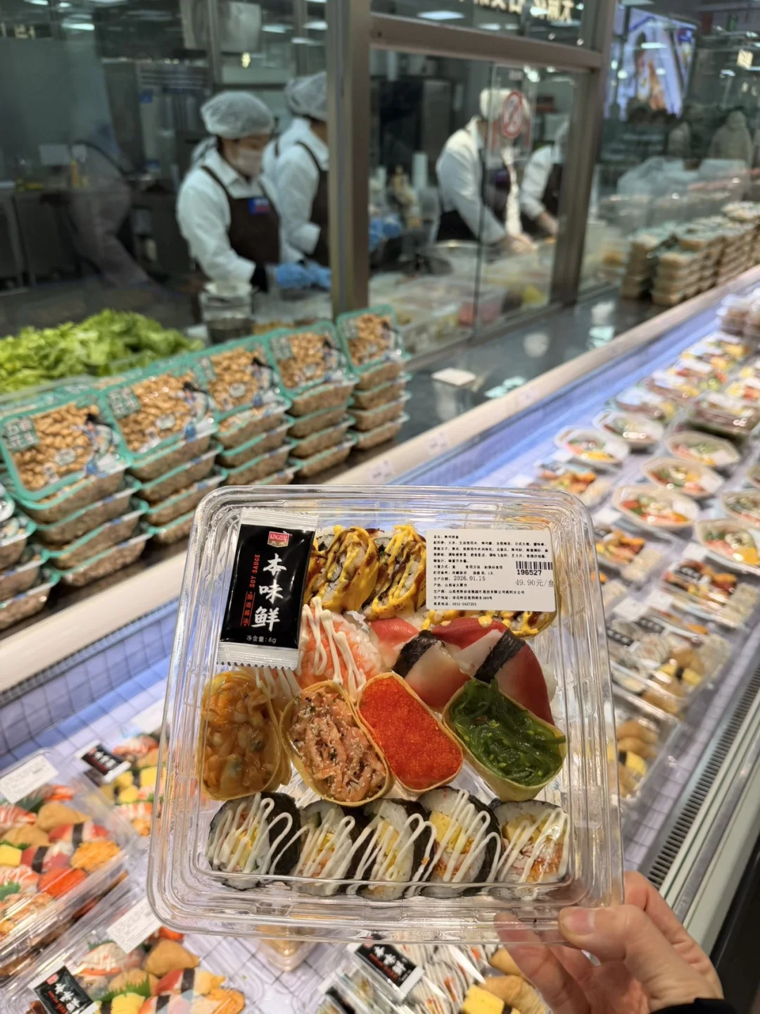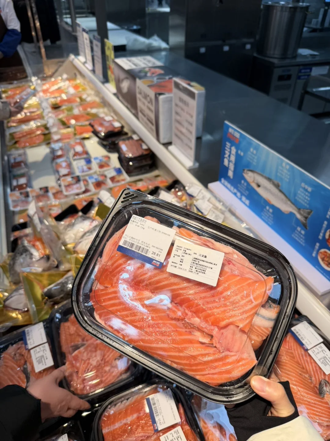 左边就是🦞生鲜区!大闸蟹包活的!还有跳跳虾捞的时候小心蹦出来!三文鱼都分割成各种部位!买买买!!这谁忍得住!