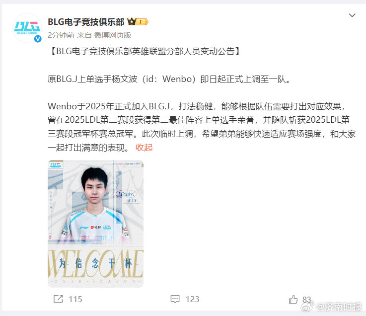 【#BLG官宣上调Wenbo#】#Bin被曝离队后BLG上调一人# 29日,:原BLG.J上单选手杨文波(id:Wenbo)即日起正式上调至一队。Wenbo于2025年正式加入BLG.J,打法稳健,能够根据队伍需要打出对应效果,曾在2025LDL第二赛段获得第二最佳阵容上单选手荣誉,并随队斩获2025LDL第三赛段冠军杯赛总冠军。此次临时上调,希望弟弟能够快速适应赛场强度,和大家一起打出满意的表现。#Bin疑似离队#