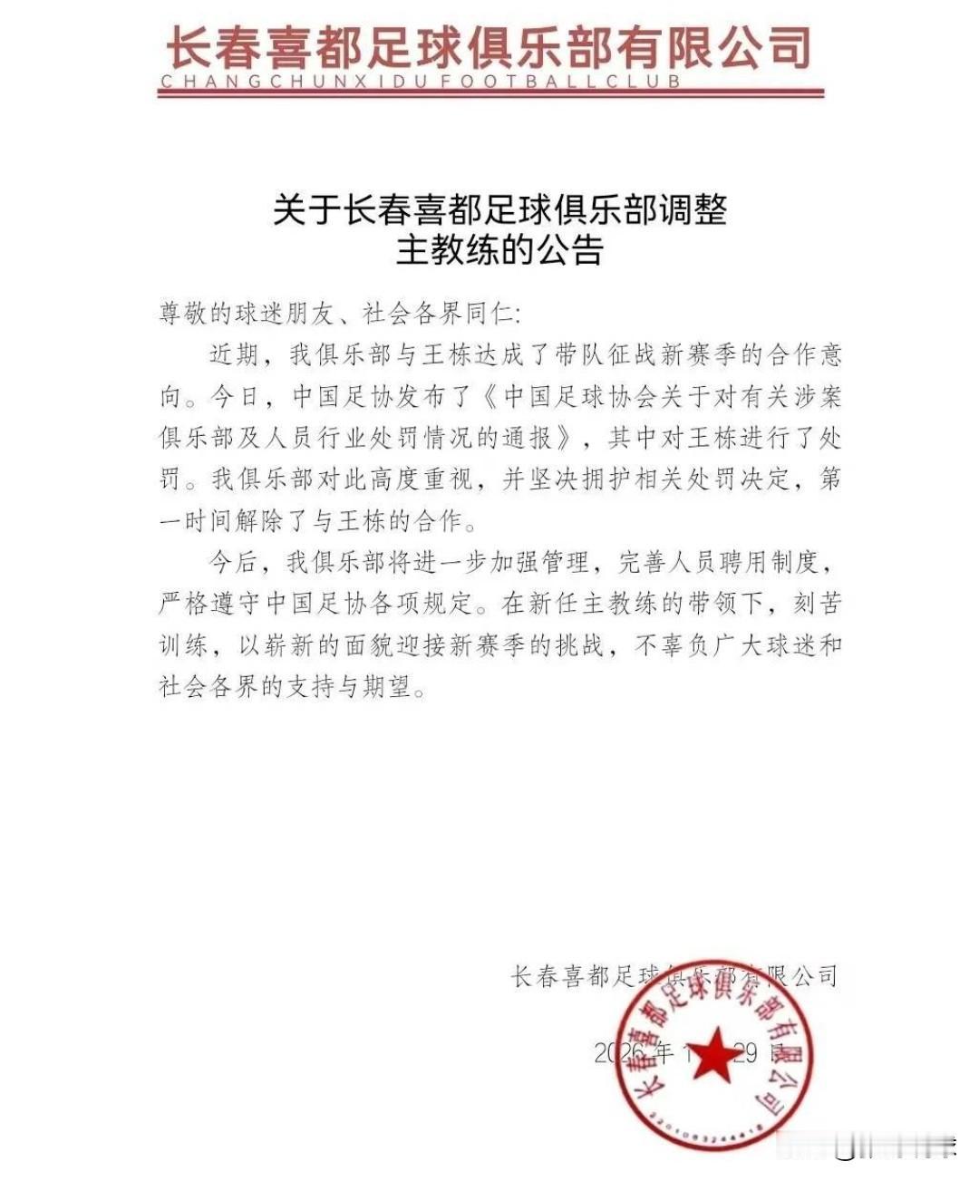 王栋被终身禁止从事与足球相关的活动,长春喜都第一时间更换主教练,喜都宣布结束与王栋的合作,这也意味着王栋的教练团队一场比赛没踢就下课了。 这种处罚有什么意义,没被处罚的就都干净吗,就那种大环境,真正该处罚的就是足协呀,王栋还是太可惜了,这个处罚也太过严厉,这处罚值得商榷。