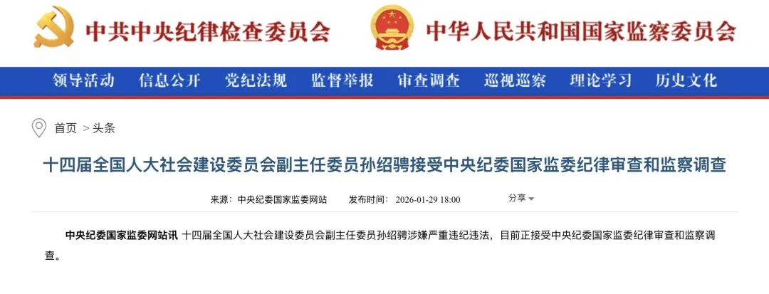 中央纪委国家监委网站1月29日消息,十四届全国人大社会建设委员会副主任委员孙绍骋涉嫌严重违纪违法,目前正接受中央纪委国家监委纪律审查和监察调查。