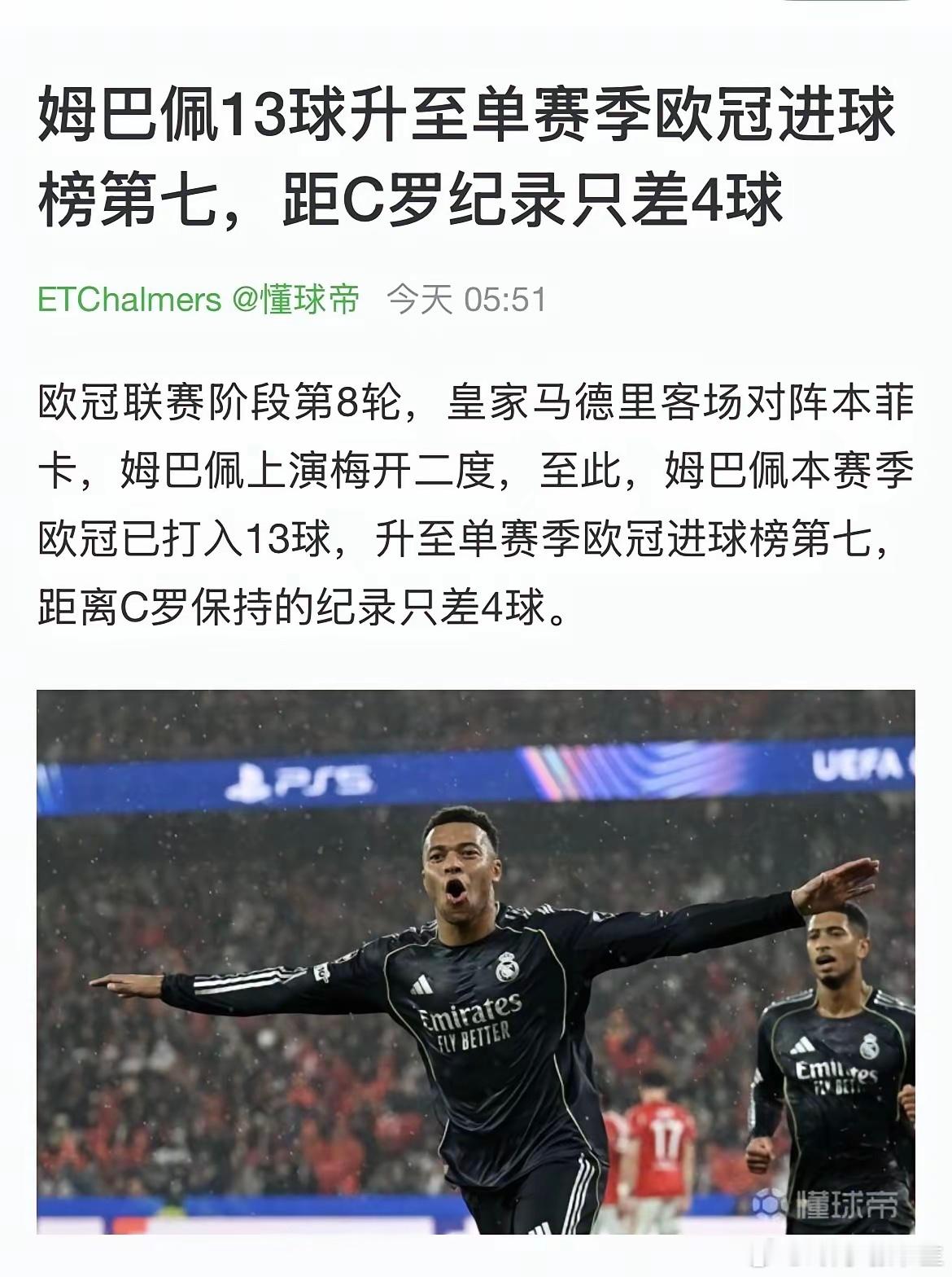 姆巴佩的单赛季欧冠进球数来到13粒,距C罗保持的纪录还有4球差距。C罗粉丝已经慌了:改制前后的没必要一起评了吧。其实他们就是怕姆总监破了罗总裁的记录。全历史中,C罗某一项数据最显眼,就强调全历史(总进球);93年改制后,C罗某一项数据最突出,就强调改制后(决赛进球数)。本来他还有很重要的一项,也是改制后最强,即5个冠军数,可惜24年被莫德里奇和克罗斯他们给打破了,6个冠军了。足球皇马姆巴佩欧冠c罗