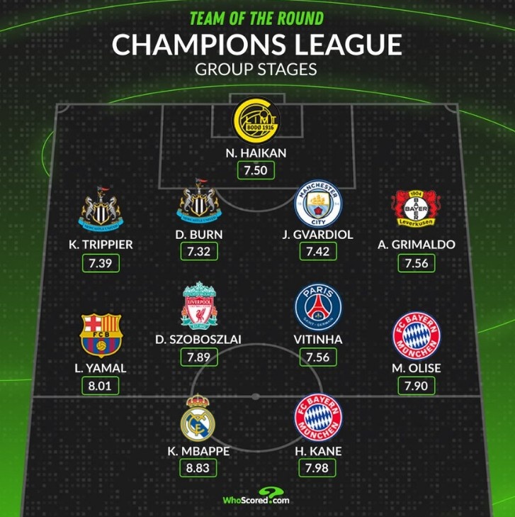 中场:亚马尔(巴萨)、索博斯洛伊(利物浦)、维蒂尼亚(巴黎)、奥利塞(拜仁)