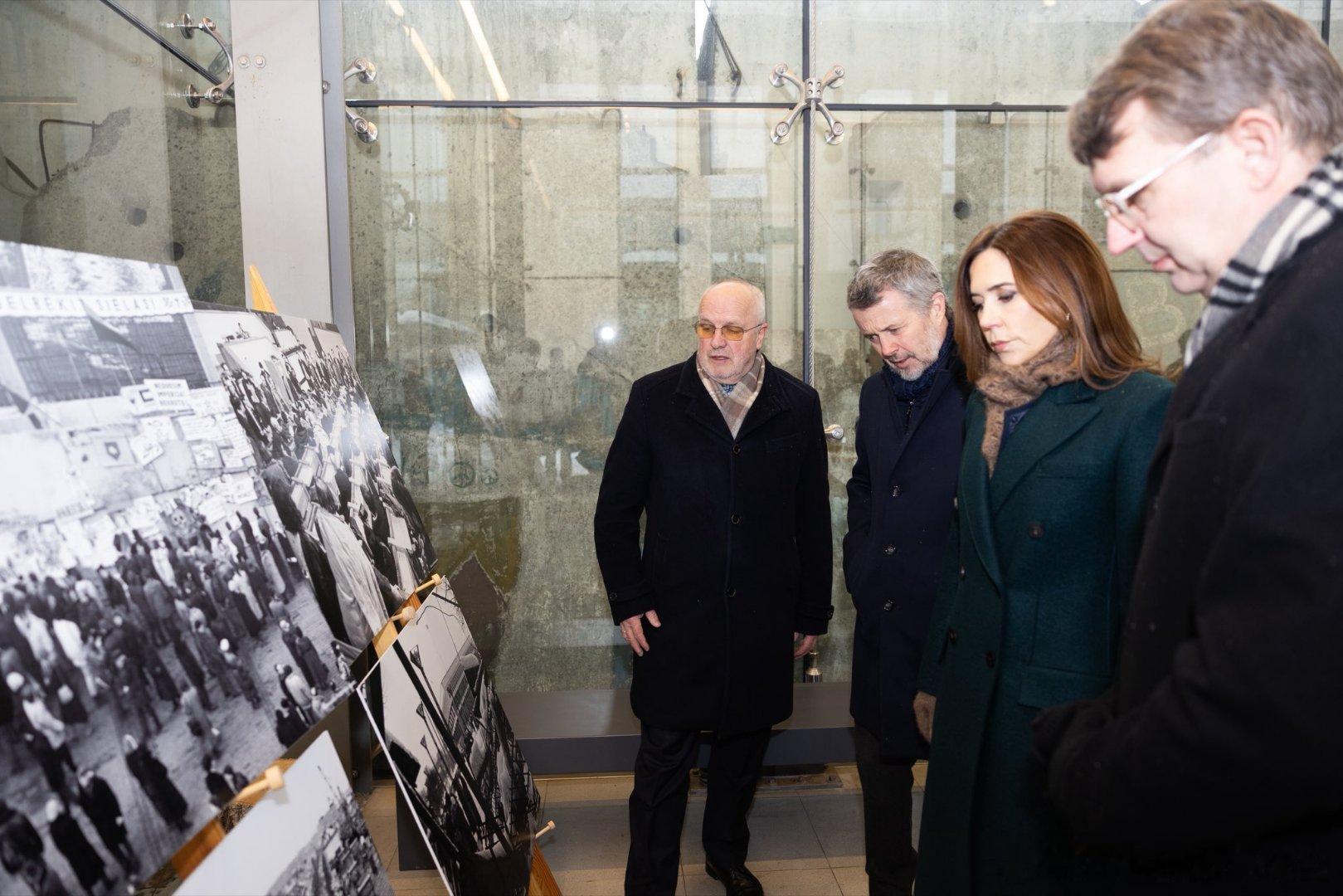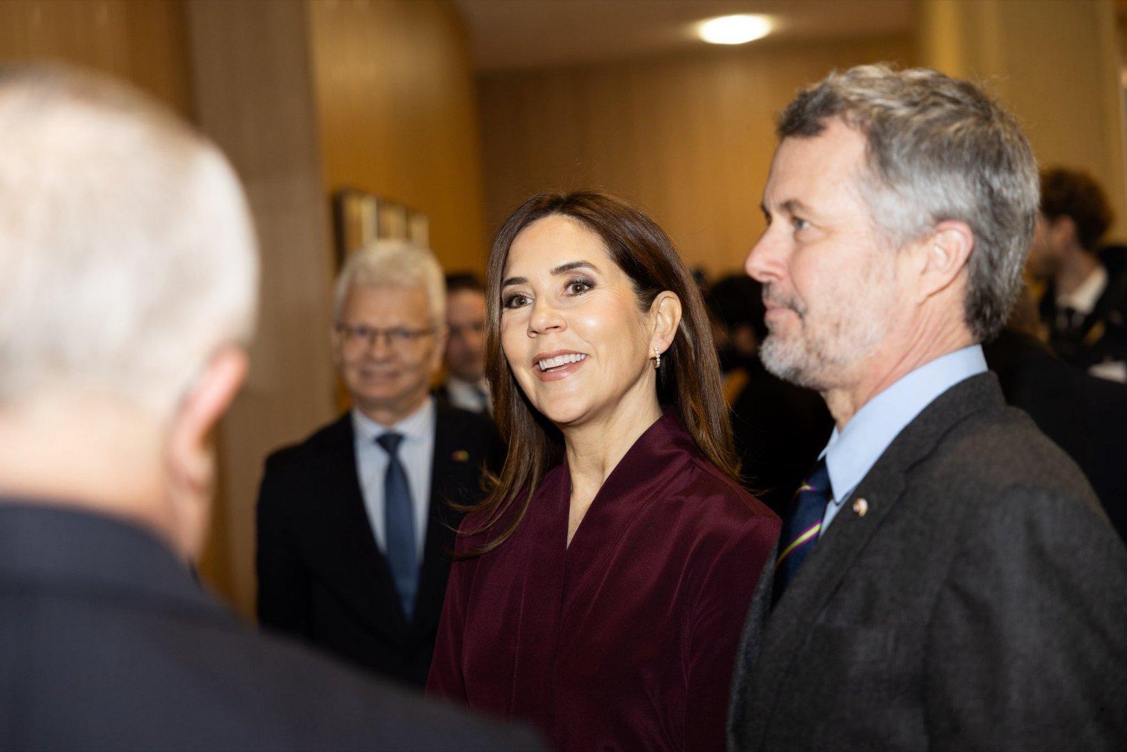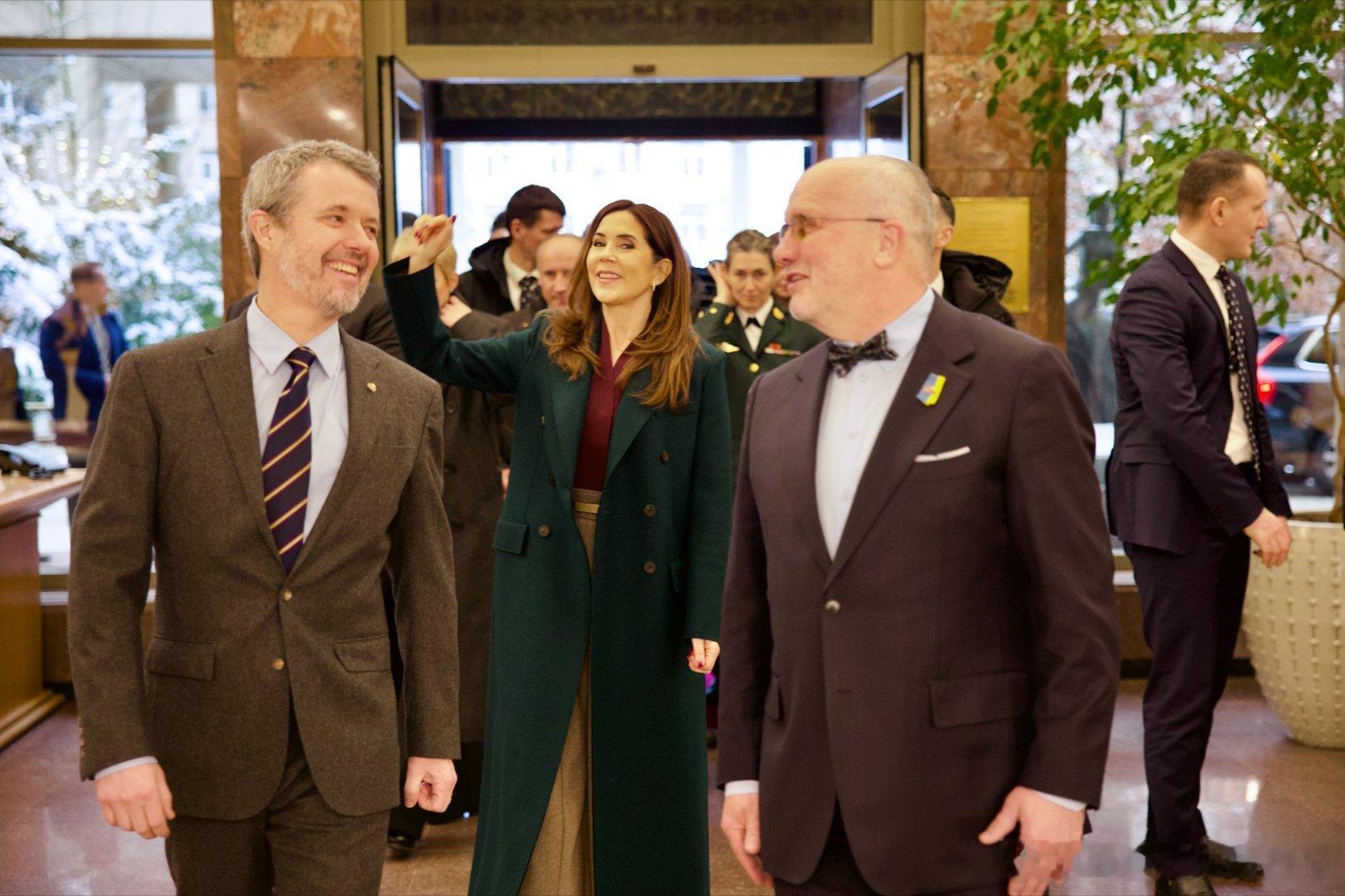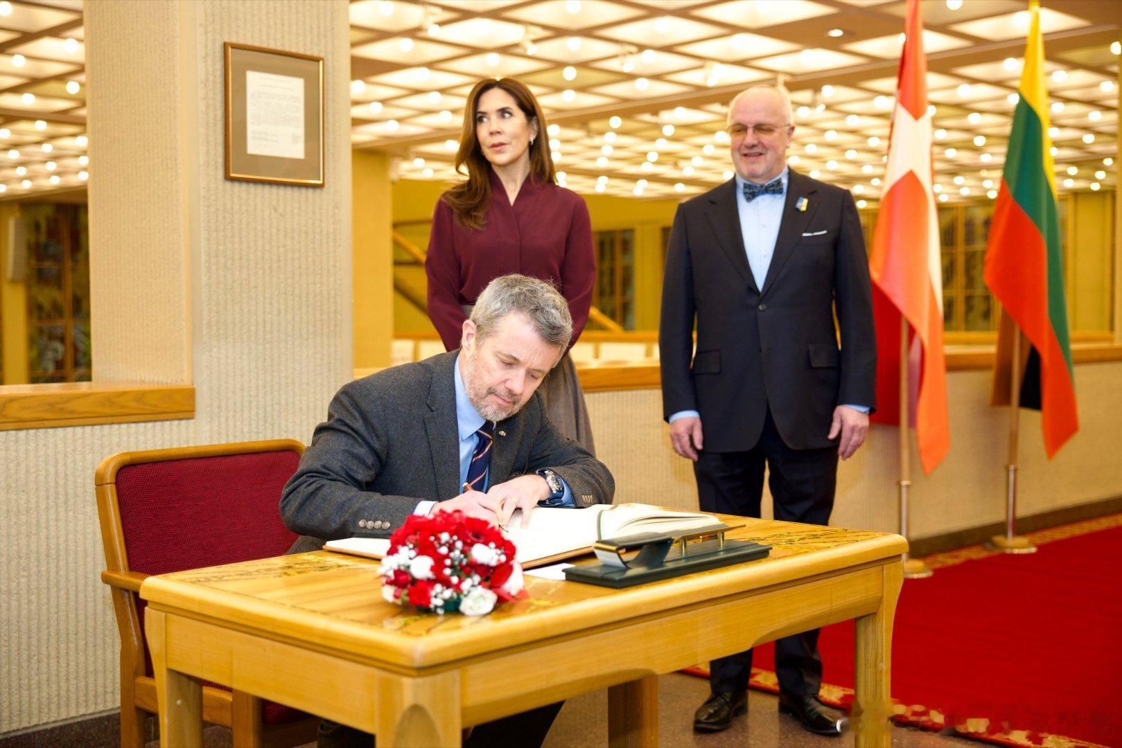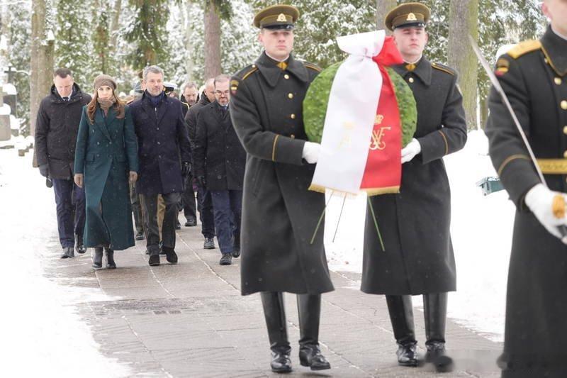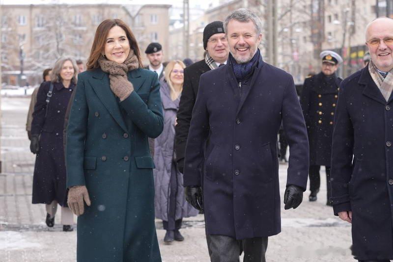新闻 2026.1.29 丹麦国事访问立陶宛Day 2,分别参观立陶宛能源与技术博物馆,立陶宛议会,向安塔卡尔尼斯公墓敬献花圈等活动,大玛丽的深绿色双排扣大衣来自Harris Wharf,酒红色上衣和半裙分别来自The Fold和Max Mara,半裙太厚外加腰带显得人很壮实。