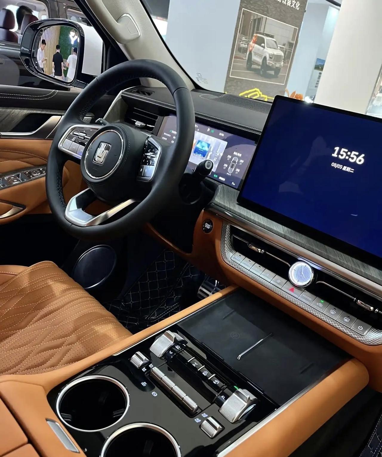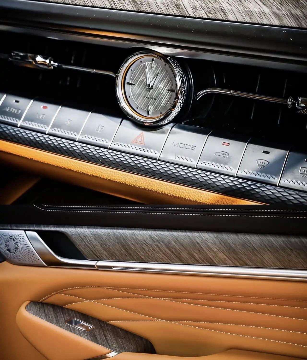 我发现很多车企的新车,很少会配带石英表了,但是配上感觉还是挺和谐的,图片是坦克500中控这一块配带的石英表