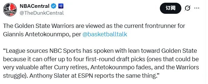 NBC体育报道,消息人士透露,金州勇士队处于字母哥争夺战的领跑位置,因为他们最多能拿出四个首轮签(考虑到库里退役、字母哥状态下滑后勇士或将陷入挣扎,这些选秀权未来价值可期)。勇士队记Slater也给出了相同报道。联盟高管认为:“雄鹿越快交易字母哥,勇士在竞价大战中胜出的几率就越大。”勇士已联系雄鹿,愿意送出除库里外所有资产。