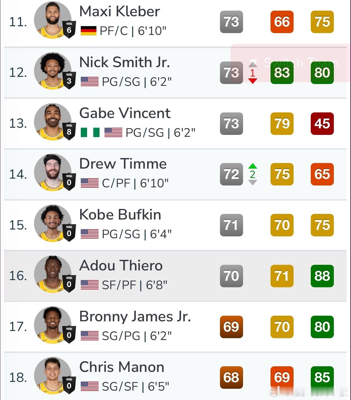 NBA2K26进行赛季球员能力值第6次更新,能力值提升的主要球员有: 文班亚马96,恩比德90,贾马尔-穆雷90,弗拉格86。湖人此次共有5名球员能力值调整,2升3降艾顿81⬇️80八村垒80 ⬇️79斯玛特77⬆️78尼克-史密斯74⬇️73朱-蒂米70⬆️72NBA点赞成金