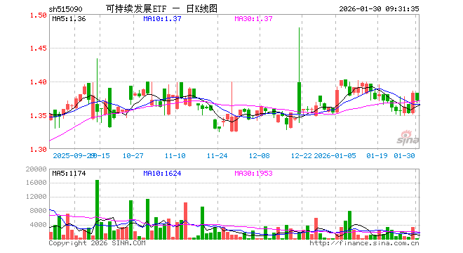 1月30日,可持续发展ETF(515090)开盘涨0.00%,报1.383元。可持续发展ETF(515090)重仓股方面,宁德时代开盘涨1.90%,贵州茅台跌0.19%,中国平安涨0.01%,中际旭创涨0.38%,紫金矿业跌5.18%,招商银行涨0.00%,美的集团跌0.36%,兴业银行涨0.05%,长江电力涨0.04%,恒瑞医药跌0.19%。