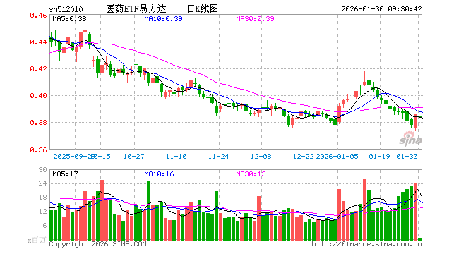 1月30日,医药ETF易方达(512010)开盘跌0.52%,报0.384元。医药ETF易方达(512010)重仓股方面,恒瑞医药开盘跌0.19%,药明康德跌0.17%,迈瑞医疗跌0.03%,联影医疗涨0.23%,爱尔眼科跌0.79%,片仔癀跌1.68%,云南白药跌0.36%,新和成跌1.00%,华东医药跌0.65%,复星医药涨0.00%。