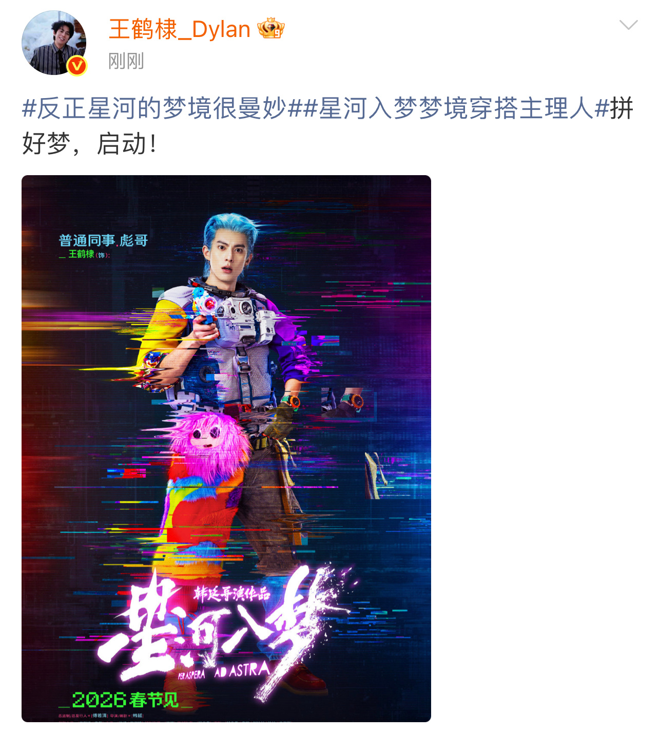 王鹤棣拼好梦启动王鹤棣蓝发海报 王鹤棣电影《星河入梦》蓝发海报,多巴胺造型帅出新