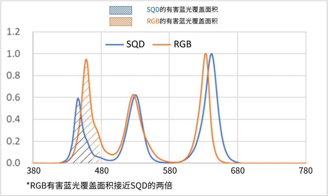 护眼体验的差距更凸显技术成熟度的重要性。根据国标GB/T20145-2006,蓝光危害的核心是能量密度而非波长。RGB-Mini LED为了拉长蓝光波长采用发光效率低的长波段蓝光,但为保证亮度又不得不增加蓝光能量,导致有害蓝光总量反而接近SQD方案的两倍,看久了更容易造成眼睛疲劳。而SQD-Mini LED从源头降低有害蓝光总能量,缩小蓝光光谱覆盖面积,长时间观看对眼睛伤害反而更小。