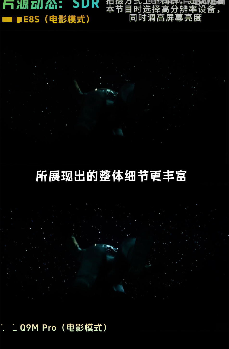 在考验对比度的星空飞船画面中,RGB-Mini LED呈现的星点稀疏且带有光晕,且飞船也快要和背景融为一体了。而SQD-Mini LED的黑场纯净深邃,能清晰呈现更多星点细节,飞船的明暗层次立体感明显更强。这种优势除了其单颗灯珠为一组分区的精细化设计外,还源于其系统级万象分区的控光优化,一个高效分区等效3~6倍的RGB控光分区,让画面亮部通透、暗部纯净。