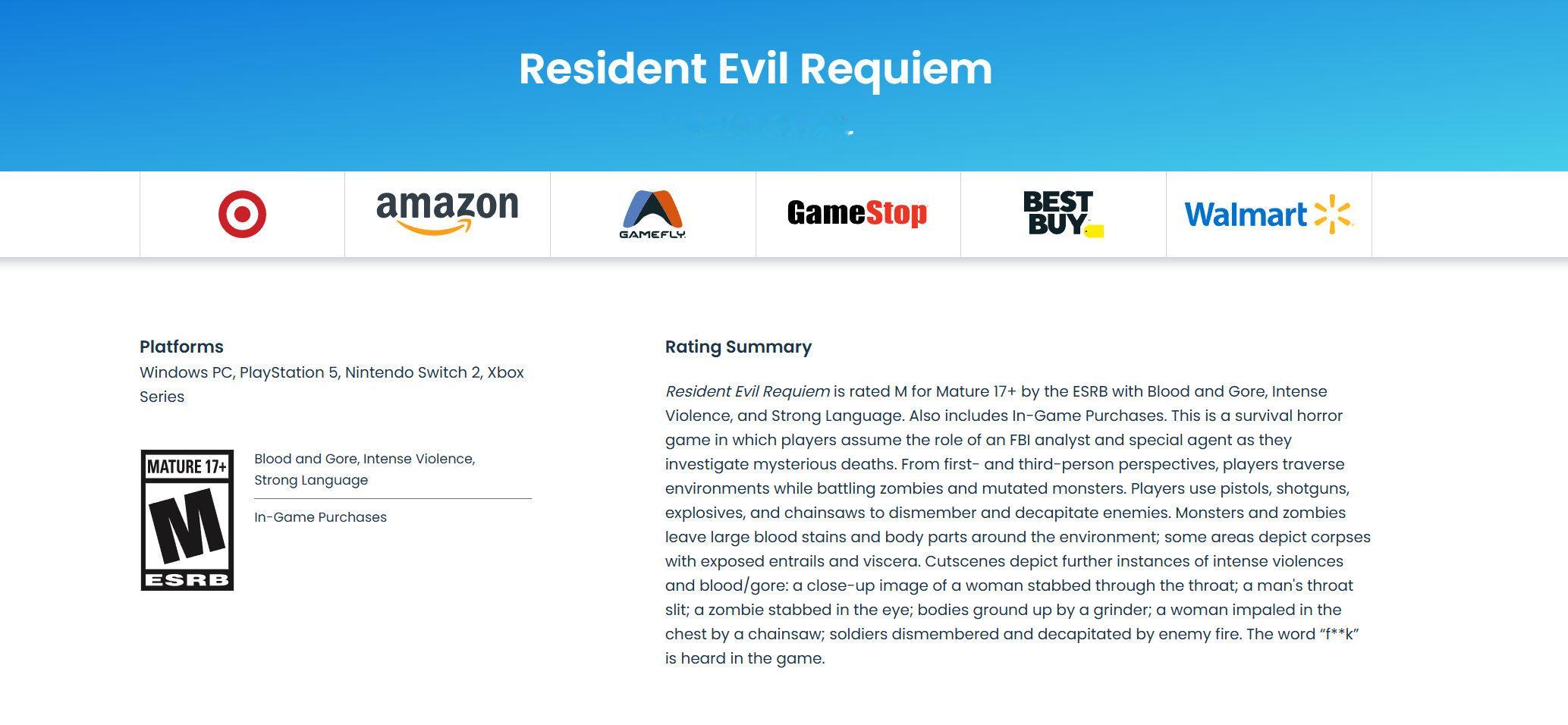《生化危机安魂曲》已通过ESRB评级,评级为M级(17+),游戏包含血腥暴力、激烈暴力、粗俗语言以及含游戏内付费项目。本作将于2月27日登陆PC/NS2/PS5/Xbox平台,Steam标准版售价348元。