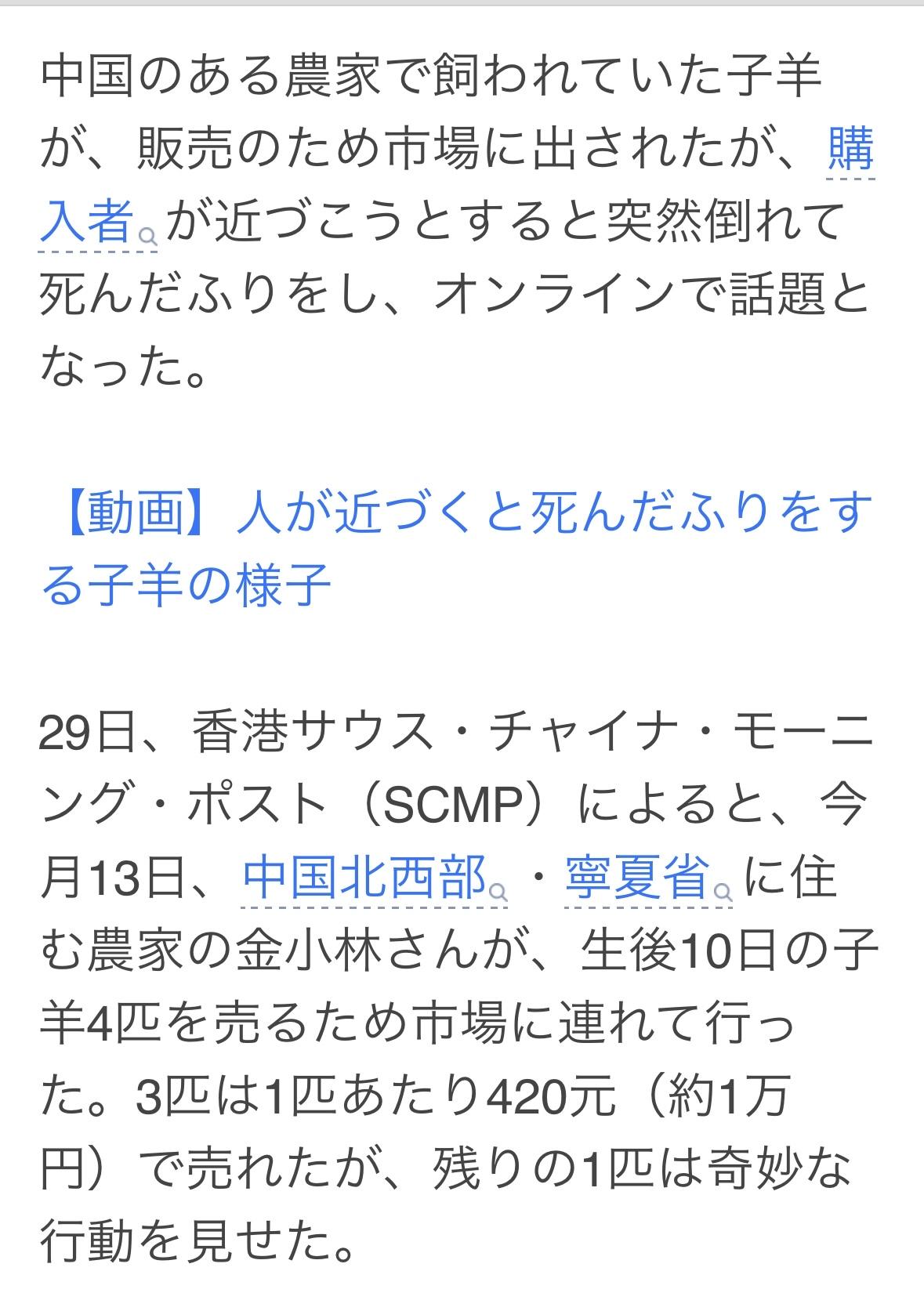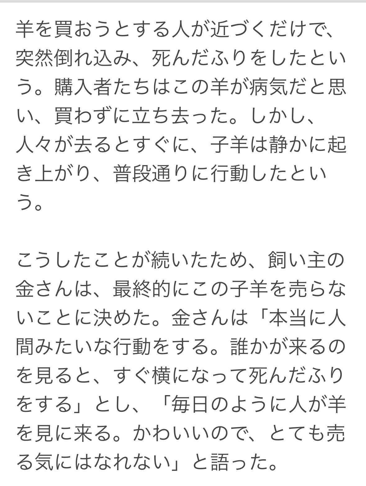 宁夏农民金晓林带着四只十天大的小羊羔去市场卖。他卖掉了三只,每只420元人民币,但剩下的那只却行为怪异。 每当有买家靠近时,这只小羊羔就会突然倒地装死。买家以为它生病便走开了。然而,买家一走,小羊羔就安静地站起来恢复了正常。 这种情况持续发生后,主人金晓林最终决定不卖了。说:它就像人一样,一看到有人过来就躺下装死,几乎每天都有人来看它,它太可爱了,我舍不得卖掉它。 金晓林的亲戚拍摄了一段小羊羔的视频,并上传到网上,点击量已超过1000万次,成为网络热议话题。有人出价13万元人民币购买这只羊,但金拒绝了。