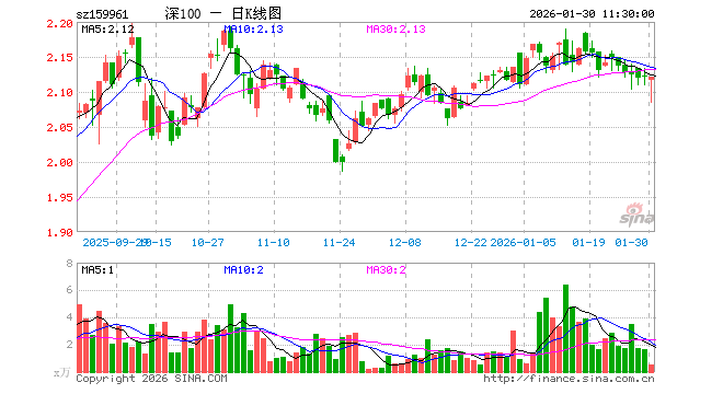 1月30日,截止午间收盘,深100ETF方正富邦(159961)跌0.09%,报2.121元,成交额118.81万元。深100ETF方正富邦(159961)重仓股方面,宁德时代截止午盘涨2.93%,中际旭创涨4.07%,新易盛涨4.40%,美的集团涨0.95%,东方财富跌1.73%,立讯精密涨0.73%,阳光电源涨3.30%,比亚迪跌1.21%,五粮液跌3.87%,胜宏科技涨2.25%。